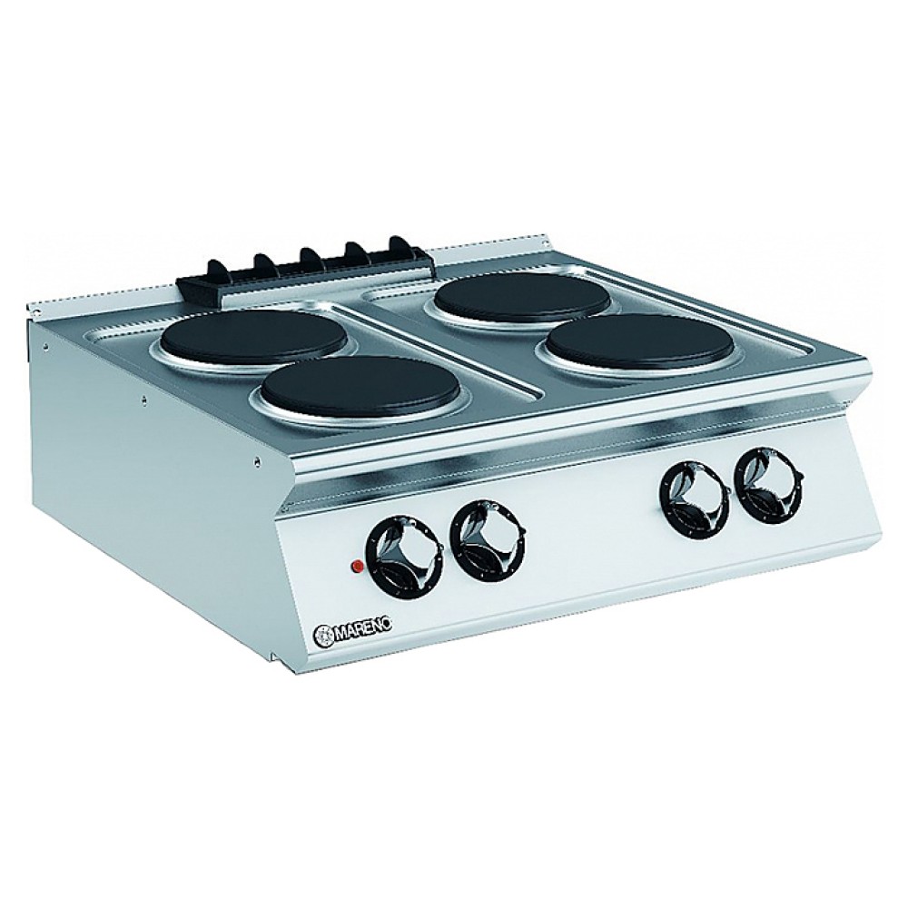 Плита электрическая MARENO NC78EC предназначена для приготовления широкого спектра блюд, подходит для использования на предприятиях общественного питания: в кафе, ресторанах, столовых и т.д. Модель оснащена четырьмя конфорками мощностью 2,6 кВт, 7-позиционным переключателем для регулировки тепла и светодиодным индикатором сигнализации на панели управления. Корпус изготовлен из нержавеющей стали AISI 304.