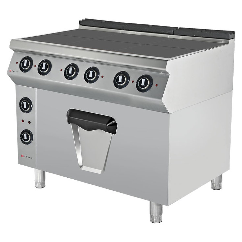 Электрическая плита Tatra TER.129OM серии 900 используется на предприятиях общественного питания и торговли для приготовления различных блюд из мяса, птицы, рыбы и овощей в наплитной посуде, а также жарки и выпекания в жарочном шкафу. Модель оснащена 6 конфорками, статическим электрическим жарочным шкафом MAXI, световыми индикаторами работы нагревательных элементов и регулируемыми по высоте ножками. Подъемные конфорки со специальным креплением на петлях обеспечивают легкий доступ для обслуживания к внутренним элементам плиты. Корпус выполнен из нержавеющей стали, конфорки - из чугуна.