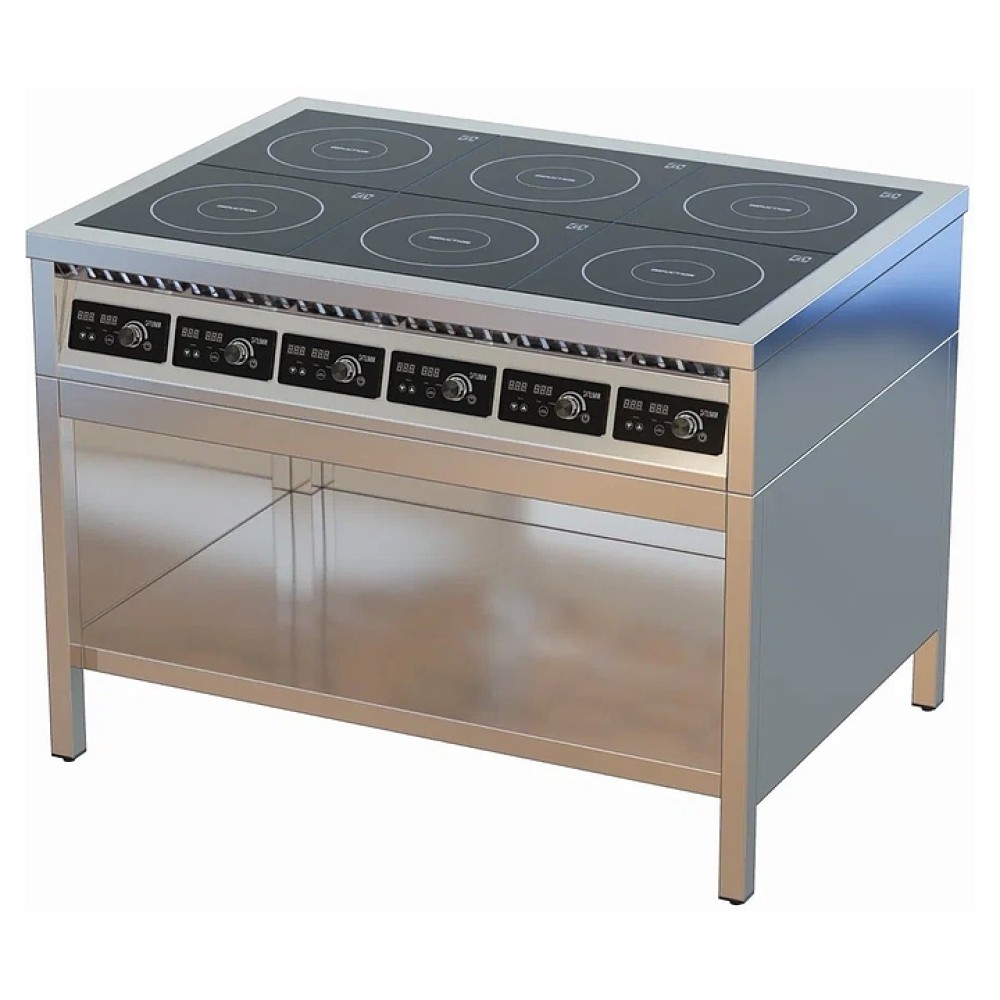 Индукционная плита ЦМИ ПИ-6Т предназначена для приготовления различных блюд в наплитной посуде на предприятиях общественного питания и торговли. Нагрев рабочей поверхности осуществляется моментально, вследствие чего затрачивается меньшее количество электроэнергии. Корпус выполнен из нержавеющей стали, сплошная полка - из нержавеющего листа AISI 430 толщиной 0,8 мм, ножки каркаса - из нержавеющей трубы 40х40х1,5 AISI 430.