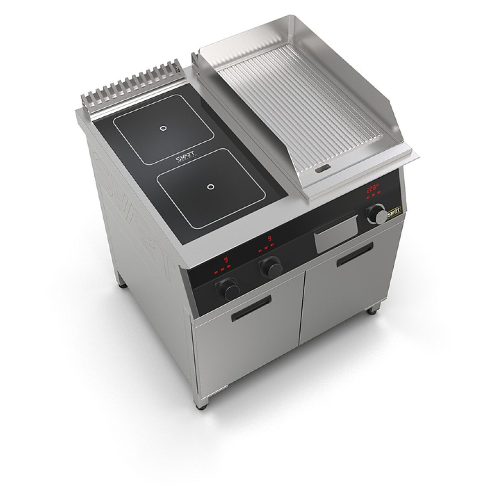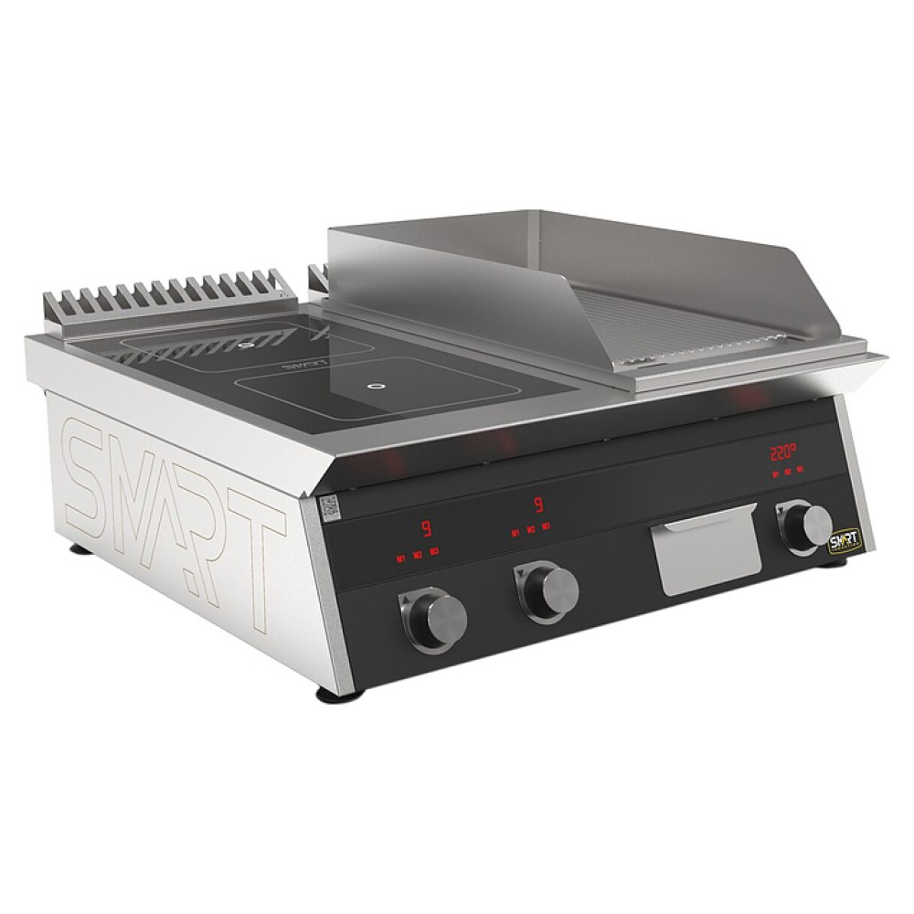 Комбинированная индукционная плита SMART INDUCTION K74-3KRB предназначена для приготовления и быстрого разогрева блюд на предприятиях общественного питания и торговли. Модель оснащена электронно-механической панелью управления с цифровой индикацией и сенсорными кнопками, 2 съемными жировыми фильтрами для отделения жира и влаги от поступающего внутрь аппарата воздуха, ящиком для сбора жира и регулируемыми по высоте ножками. Корпус и столешница выполнены из нержавеющей стали AISI430, рабочая поверхность плиты - из стеклокерамики, рабочая поверхность гриля - из нержавеющей стали, передняя панель имеет стойкое полимерное покрытие черного цвета.