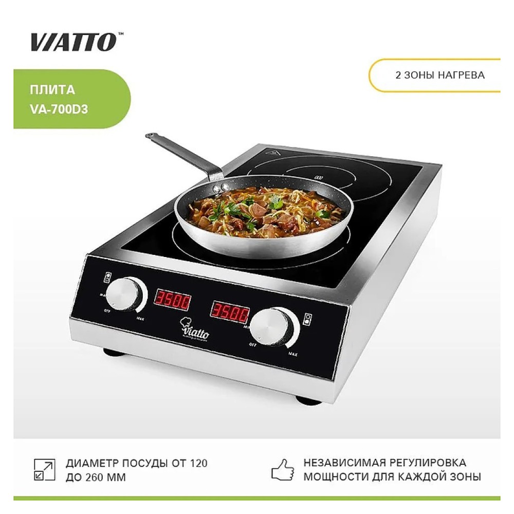 Индукционная плита VIATTO VA-700D3 предназначена для приготовления широкого спектра блюд в наплитной посуде на предприятиях общественного питания и торговли. Модель оснащена электромеханической панелью управления. Корпус выполнен из нержавеющей стали, варочная поверхность - из стеклокерамики.