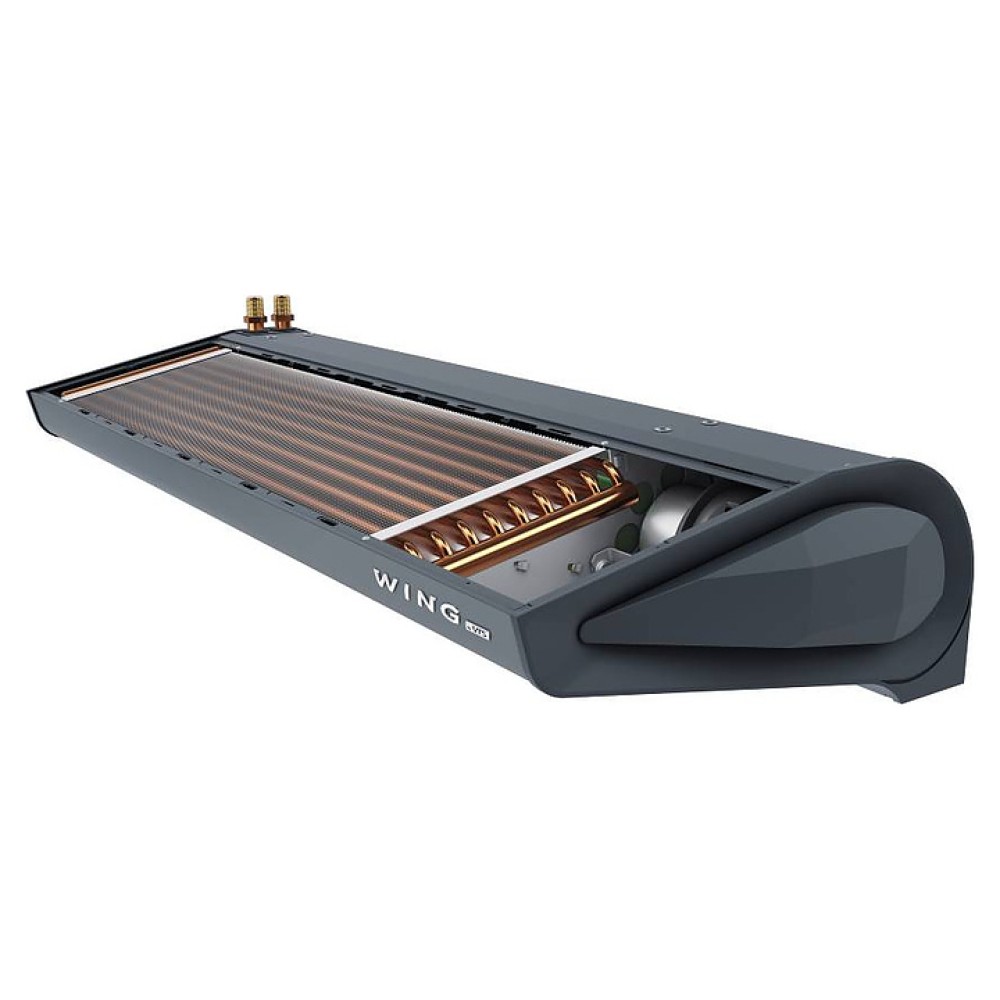 Воздушная завеса WING II W150 EC предназначена для защиты от внешнего притока холодного или теплого воздуха, пыли и неприятных запахов путем установки в дверных проемах жилых, торговых, административных и складских помещений, автосервисов, гостиниц, медицинских и общеобразовательных учреждений. Модель оснащена воздухозабоной решеткой сверху и термовыводящими направляющими снизу, а также дополнительными воздушными отверстиями и стилизованными под ювелирную огранку крышками на боковых панелях. Обтекаемый корпус в форме крыла выполнен из высококачественной оцинкованной стали с антикоррозийным покрытием порошковой краской оттенка серый антрацит, трубки теплообменника – из меди.