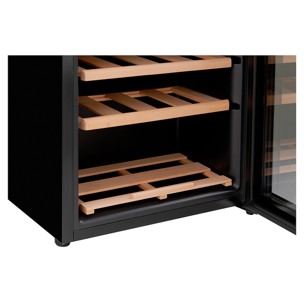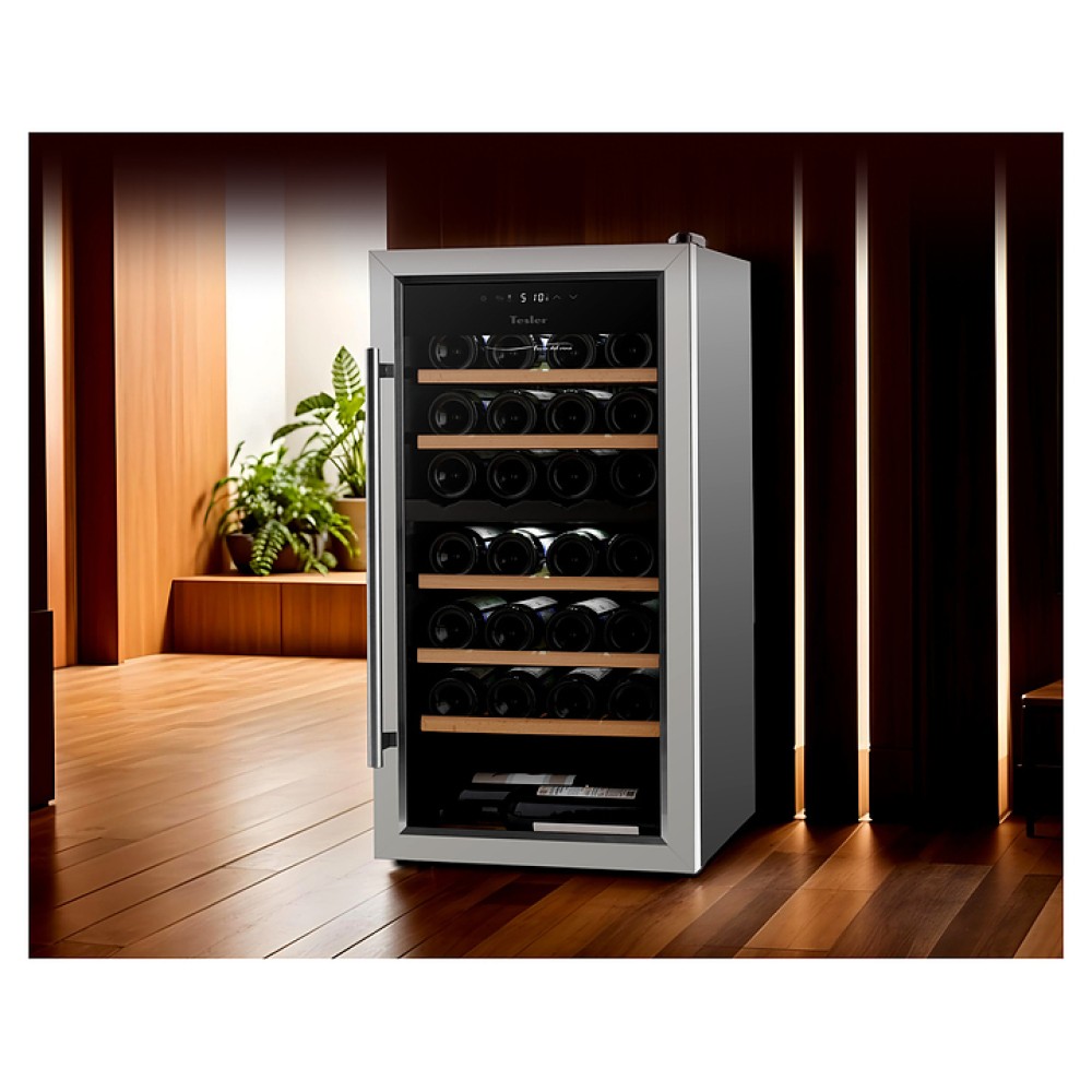 Винный шкаф TESLER CWC-300 предназначен для охлаждения, хранения при оптимальных условиях и демонстрации бутилированного вина различных сортов в барах, ресторанах, специализированных магазинах, подсобных складских помещениях, а также в домашних условиях. Модель оснащена холодильной камерой с 5 полками и 1 подставкой, удобной ручкой, дисплеем, распашной дверью и электронным управлением. Полки и подставка выполнены из дерева, дверца - из двойного стекла с зеркальной поверхностью, рамка - из нержавеющей стали.