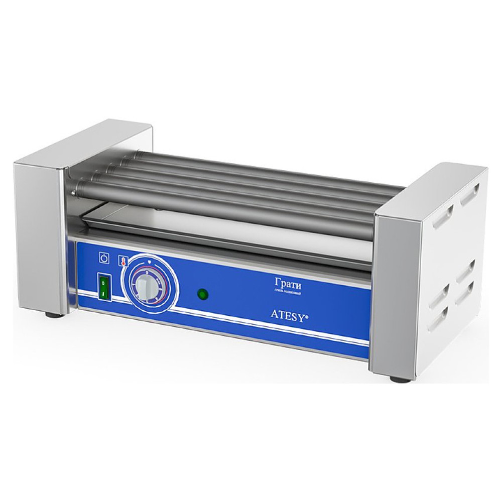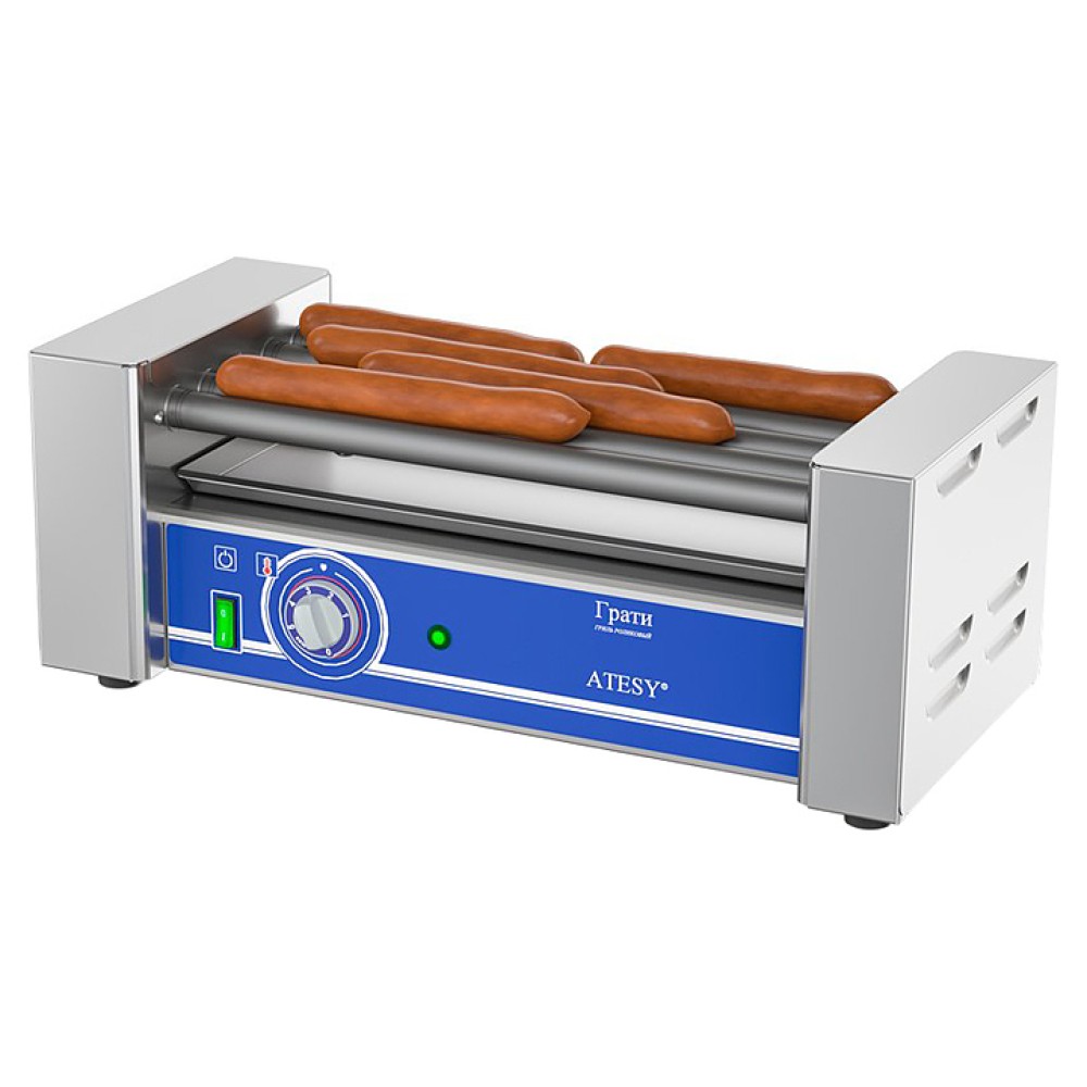Роликовый гриль ATESY Грати-5.440-02 используется на предприятиях общественного питания и торговли для обжаривания сосисок, сарделек, а также мясных и рыбных батончиков цилиндрической формы. Модель оснащена терморегулятором и индикаторной лампой. Все корпусные элементы, включая ролики, изготовлены из пищевой нержавеющей стали, разрешенной Госсанэпиднадзором для контакта с пищей.