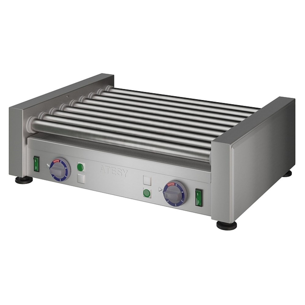 Роликовый гриль ATESY Комбат ГР-9Р-450-02 используется на предприятиях общественного питания и торговли для обжаривания сосисок, сарделек, а также мясных и рыбных батончиков цилиндрической формы. Модель оснащена терморегулятором и индикаторной лампой. Корпус и ролики выполнены из нержавеющей стали.