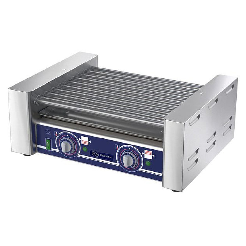 Роликовый гриль KAYMAN ГР-2-9 А предназначен для обжаривания сосисок, сарделек, мясных и рыбных батончиков, используемых для приготовления хот-догов на предприятиях общественного питания и торговли. Модель оснащена 2 зонами нагрева и 2 ступенчатыми регуляторами температуры, расположенными на передней панели. Все корпусные элементы, включая ролики, выполнены из пищевой нержавеющей стали.