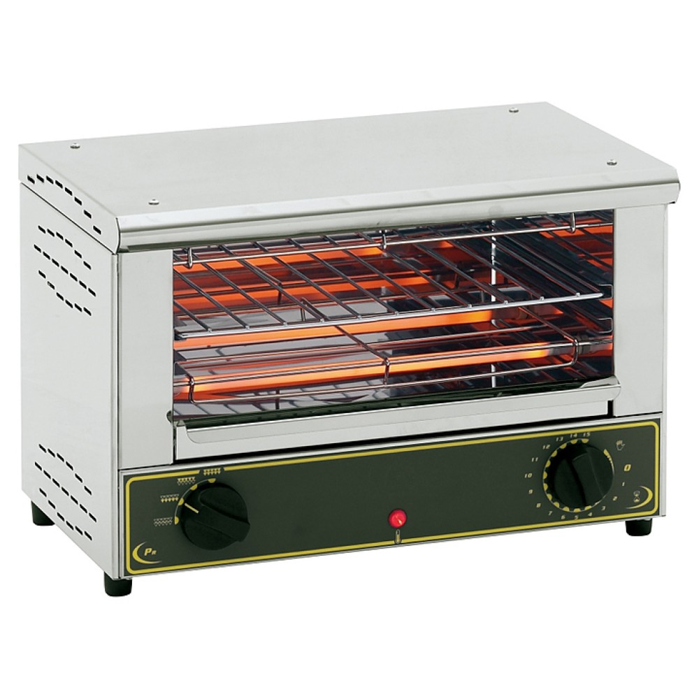 Тостер Roller Grill BAR 1000 предназначен для разогрева и поджаривания готовых к употреблению кулинарных изделий: булочек, бутербродов, рулетов, закрытых сэндвичей, сосисок, пицц и т.д. на предприятиях общественного питания и торговли. Модель оснащена 2 поворотными тумблерами для регулировки температуры нагрева рабочей поверхности и таймером на 15 минут с возможностью отключения. Корпус выполнен из нержавеющей стали AISI 304.