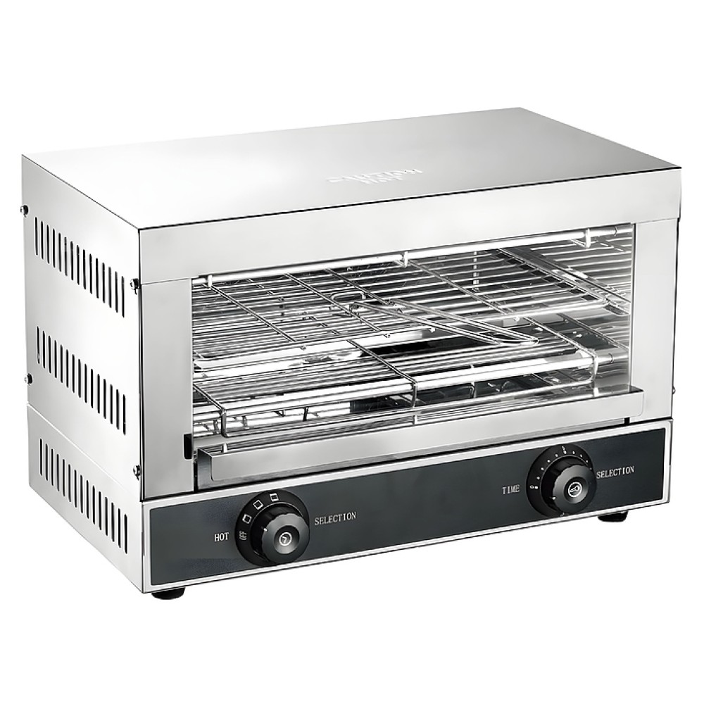 Тостер VIATTO VA-TS-01 предназначен для подогрева и поджарки кусочков хлеба в кафе, ресторанах и на предприятиях общественного питания и торговли. Модель оснащена кварцевыми нагревательными трубками с защитными решетками и механической панелью управления. Корпус выполнен из нержавеющей стали, решетка – из железа с никелированным покрытием.