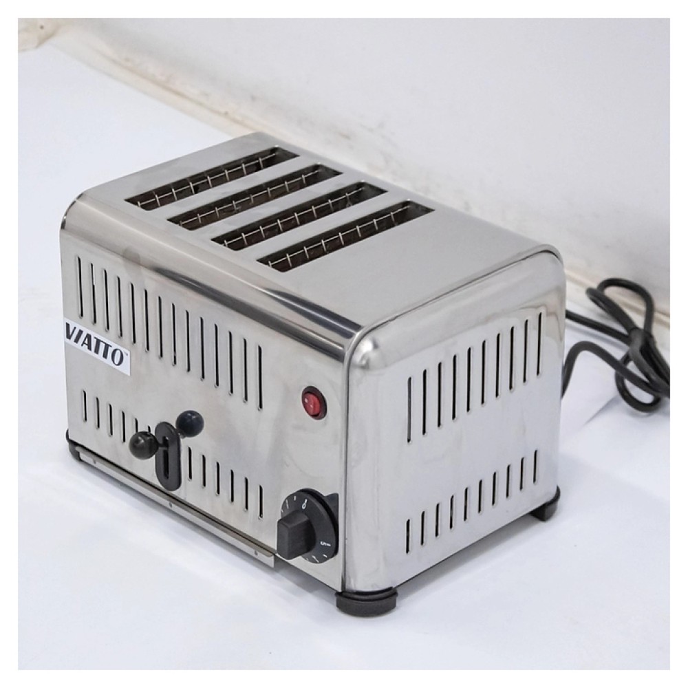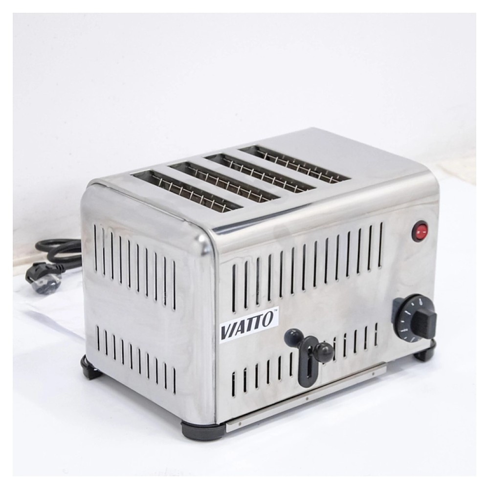 Тостер VIATTO VST-4 предназначен для подогрева и поджарки кусочков хлеба на предприятиях общественного питания и торговли. Перфорированные стенки корпуса служат для оптимального охлаждения и предотвращают перегрев. Корпус выполнен из нержавеющей стали.