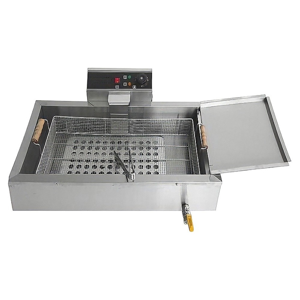 Настольная фритюрница Hualian HEF-12 используется на предприятиях пищевой промобщественного питания и торговли для приготовления чебуреков, беляшей, пончиков и аналогичных продуктов путем их обжарки в большом количестве масла. Модель оснащена трубчатым электронагревателем (ТЭНом) и расположенной над задней стенкой электромеханической панелью управления. Корпус выполнен из нержавеющей стали.