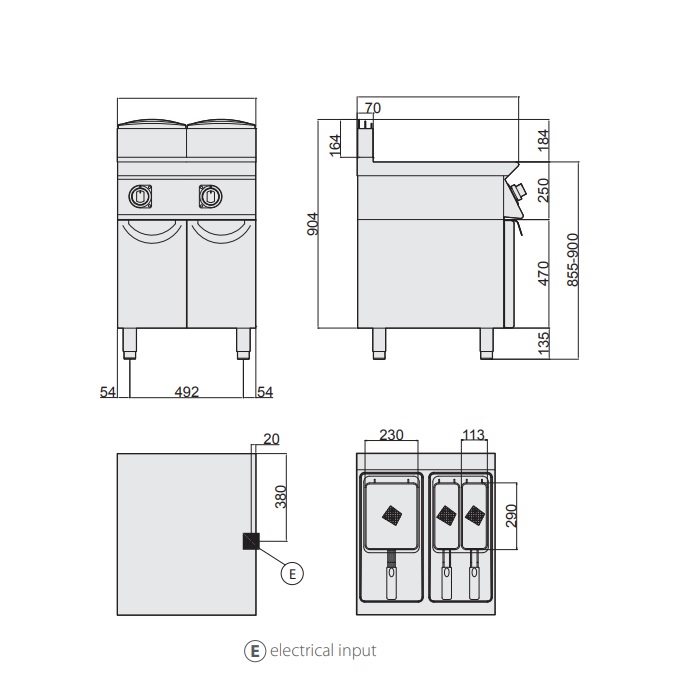 Напольная электрическая фритюрница Giorik Unika 700 FE7215 используется на предприятиях общественного питания и торговли для приготовления картофеля-фри и других продуктов путем их обжарки в большом количестве масла. Модель оснащена 2 ваннами с погружными трубчатыми электронагревателями (ТЭНами) и расположенной на наклонной фронтальной стенке электромеханической панелью управления. Внешняя облицовка корпуса выполнена из высококачественной нержавеющей стали.