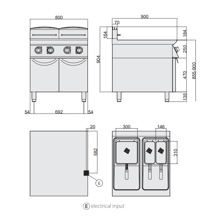 Напольная электрическая фритюрница Giorik Unika 900 FE9217 используется на предприятиях общественного питания и торговли для приготовления картофеля-фри и других продуктов путем их обжарки в большом количестве масла. Модель оснащена 2 ваннами с погружными трубчатыми электронагревателями (ТЭНами) и расположенной на наклонной фронтальной стенке электромеханической панелью управления. Внешняя облицовка корпуса выполнена из высококачественной нержавеющей стали.