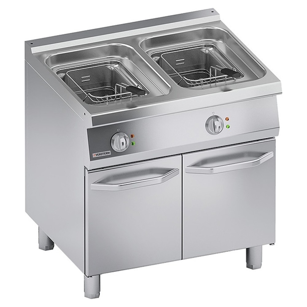 Напольная электрическая фритюрница VEROTERM VT2FGE1010 используется на предприятиях общественного питания и торговли для приготовления картофеля-фри и других блюд путем обжарки в большом количестве масла. Модель оснащена задним бортом, электромеханической панелью управления и техническим отделением с 2 дверьми с горизонтальными рукоятками. Корпус, ванны и корзины выполнены из нержавеющей стали.