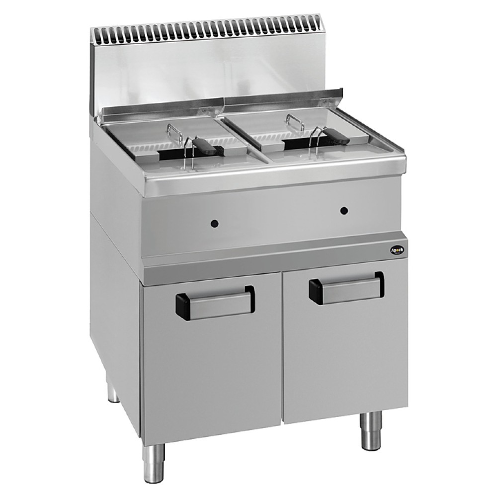 Фритюрница Apach APFG-77P/PL 700-й серии предназначена для приготовления блюд в масле на предприятиях общественного питания и торговли. Модель оснащена электромеханической панелью управления и закрытой подставкой с регулируемыми по высоте ножками. Корпус, ванны, рабочая поверхность, панель управления и вытяжная решетка выполнены из нержавеющей стали AISI 304, боковые и задняя панели - из нержавеющей стали AISI 430, корзины - из хромированной стальной проволоки, горелки, фильтры и крышки корзин - из нержавеющей стали.