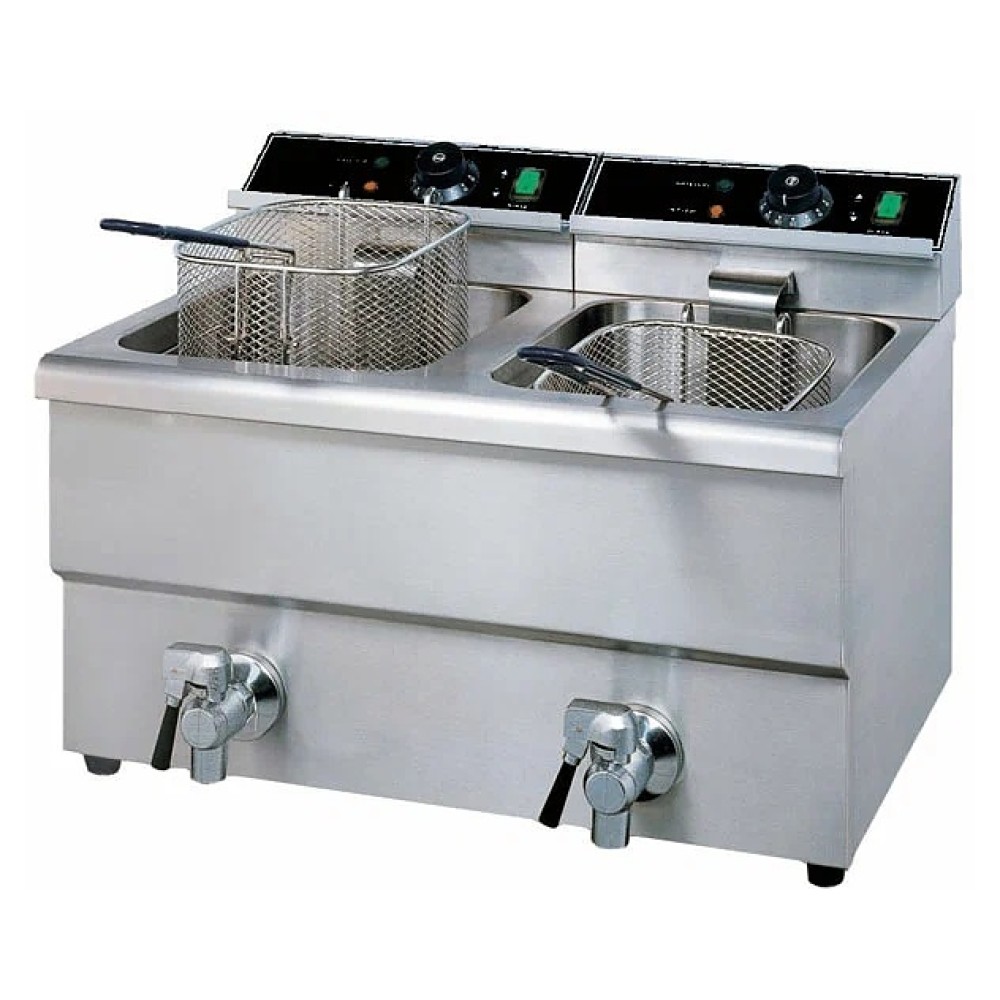 Фритюрница Hurakan HKN-FT1212N предназначена для приготовления широкого спектра блюд в большом объеме масла или жира на предприятиях общественного питания и торговли. Модель оснащена электромеханической системой управления, регулировкой температуры, холодной зоной и кранами для слива масла. Корпус выполнен из нержавеющей стали.