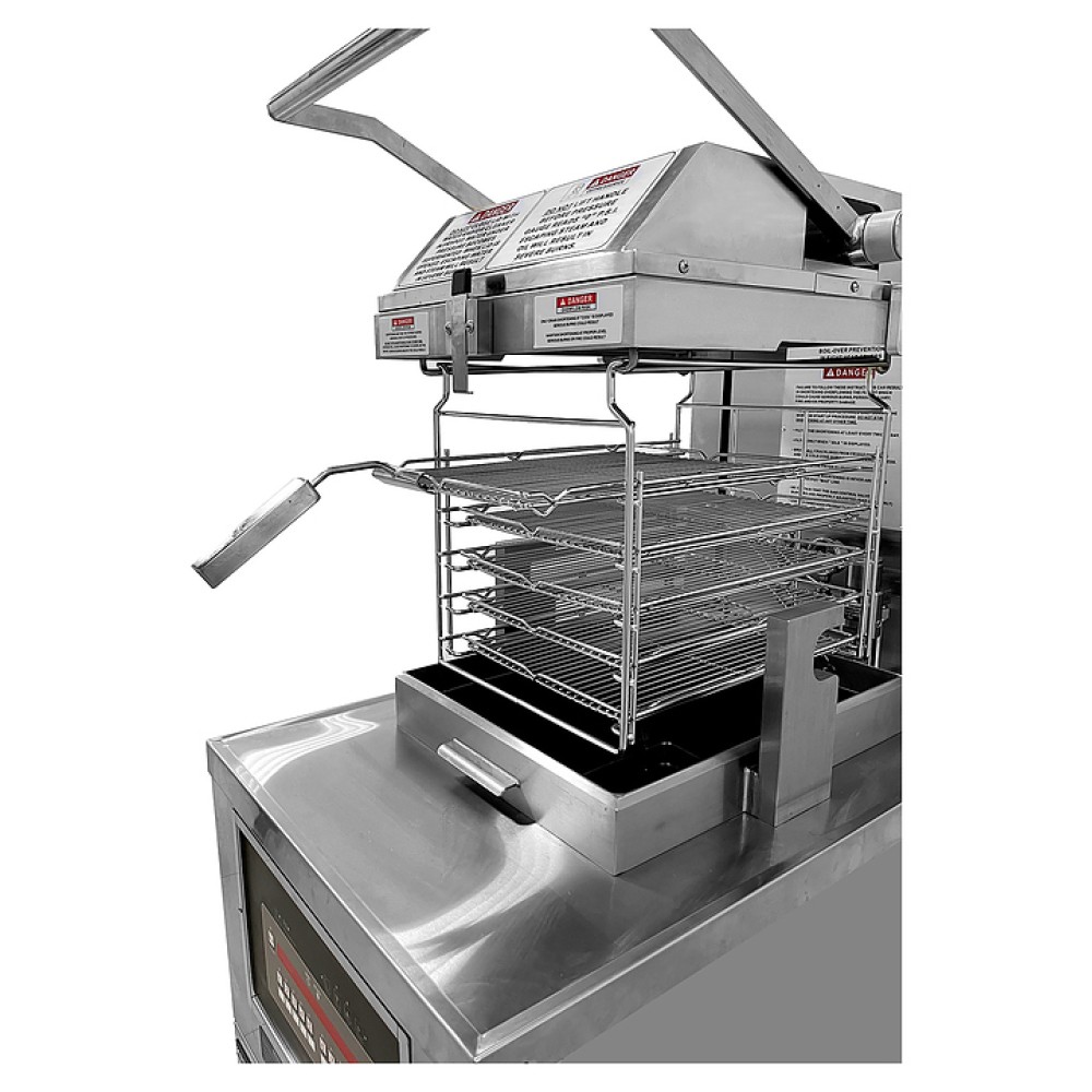 Фритюрница Kocateq PFE591 под давлением предназначена для жарки под давлением различных продуктов в большом количестве масла или жира на предприятиях общественного питания и торговли. Модель оснащена термостатом для регулировки температуры и сточным каналом для конденсата в нижней части крышки для предотвращения попадания конденсата в горячее масло при открывании крышки. Жарочная емкость выполнена из нержавеющей стали, крышка - из литого сплава алюминия.