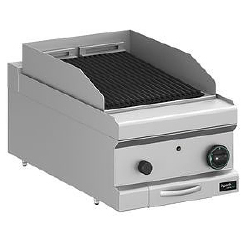 Лавовый гриль Apach APGG-77T/PL предназначен для обжарки мяса, рыбы и овощей на предприятиях общественного питания и торговли. Модель с бортами оснащена горелками с пьезоэлектрическим поджигом и системой стабилизации пламени и съемными лотками для сбора остатков пищи, масла и жира. Корпус, панель управления и вытяжная решетка выполнены из нержавеющей стали AISI 304, боковые и задняя панели - из нержавеющей стали AISI 430, горелки и лотки - из нержавеющей стали, рабочая поверхность – из чугуна.