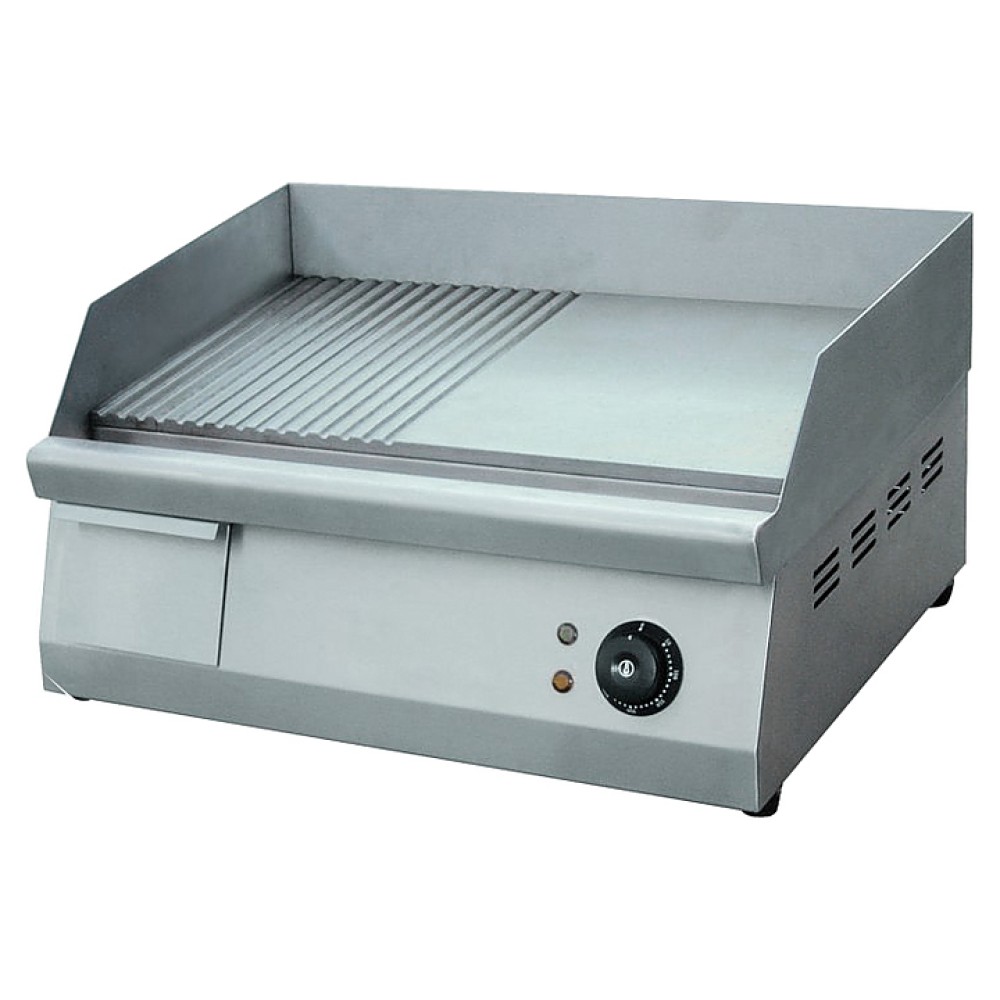 Гриль-сковорода Kocateq GH610A предназначена для приготовления жареных мясных блюд, яичницы, жареной рыбы, оладьев, котлет и гамбургеров на предприятиях общественного питания и торговли. Модель оснащена термостатом для регулировки температуры и защитным термостатом, автоматически отключающим напряжение при повреждении основного термостата. 1/2 плоская и 1/2 ребристая рабочая поверхность выполнена из специального теплопроводящего сплава, корпус - из нержавеющей стали AISI 304, ножки - из пластика.