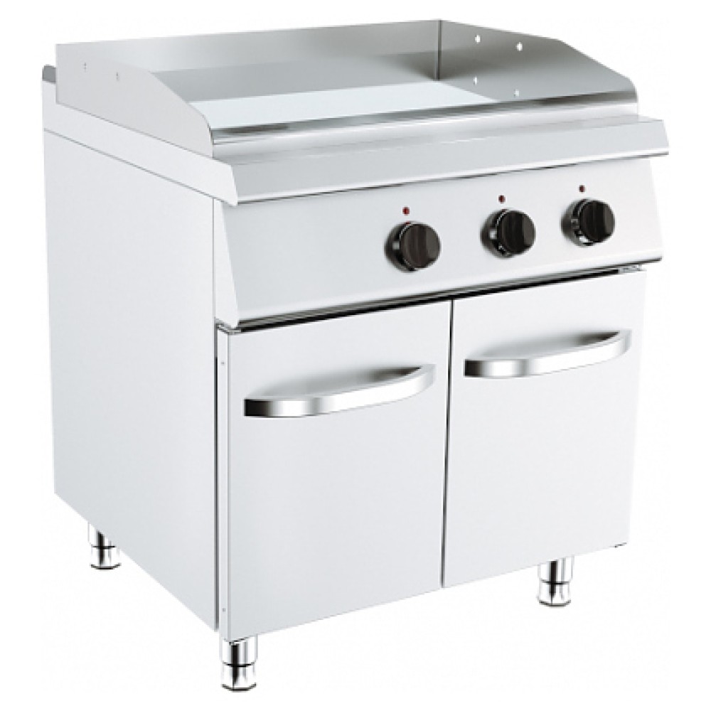 Гриль-сковорода KUSINA G7I 200E используется в составе тепловой линии 700 для приготовления жареных мясных блюд, яичницы, жареной рыбы, оладьев, котлет и гамбургеров на предприятиях общественного питания и торговли. Модель оснащена гладкой поверхностью с 2 зонами нагрева, бортиком с 3-х сторон, вместительным жиросборником и закрытым стендом с 2 распашными дверьми. Оборудование изготовлено из нержавеющей стали.