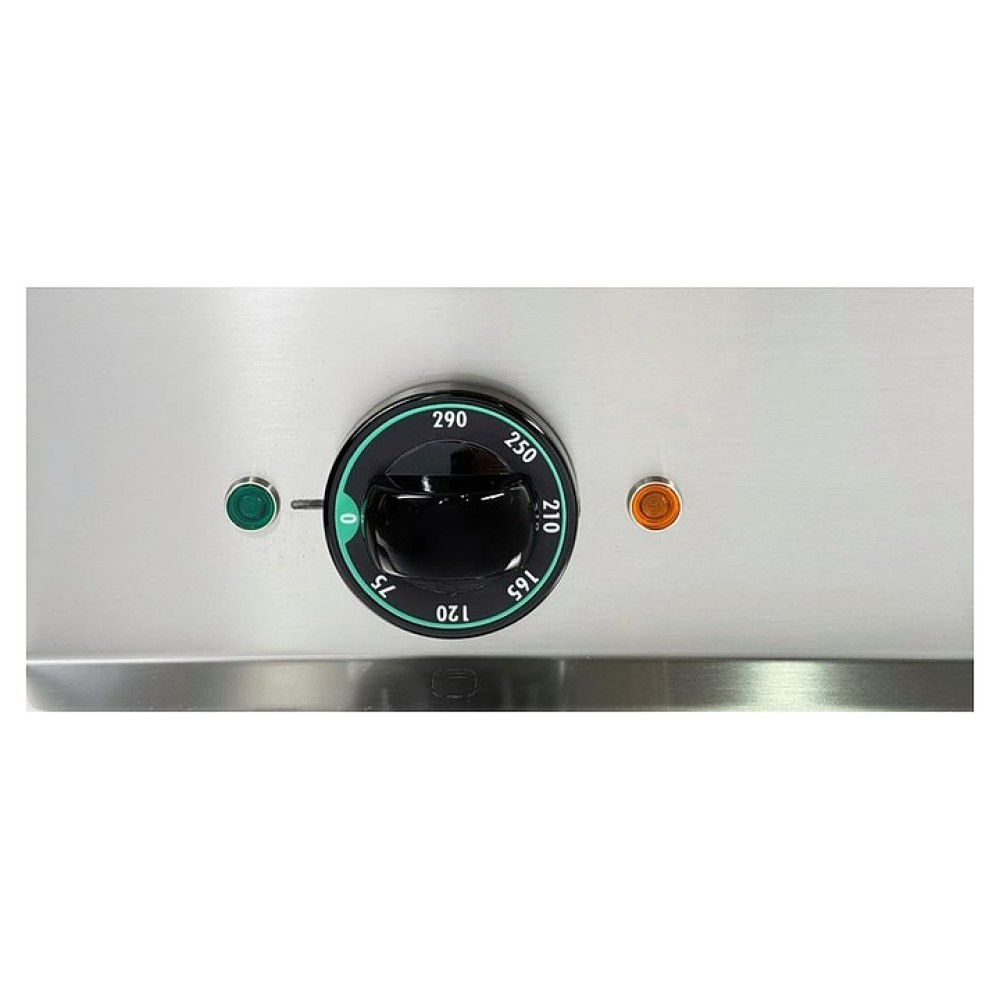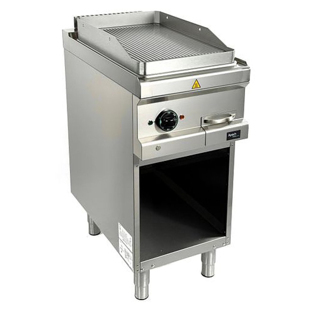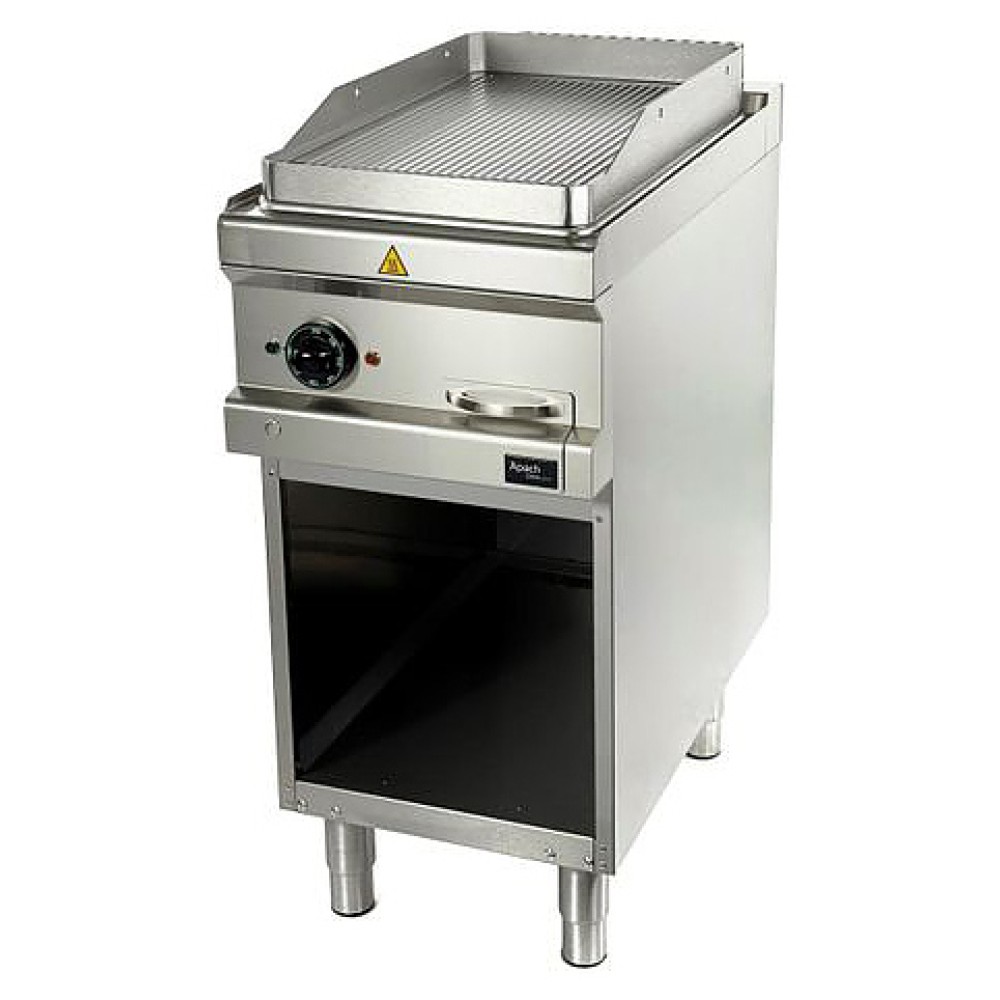 Жарочная поверхность Apach APTE-47PR/PL 700-й серии предназначена для обжарки мяса, рыбы и овощей на предприятиях общественного питания и торговли. Модель с закругленными краями и бортами оснащена электромеханической панелью управления с терморегулятором и 2 световыми индикаторами, выдвижным лотком для сбора остатков пищи, масла и жира и открытой подставкой с регулируемыми по высоте ножками. Корпус, панель управления и вытяжная решетка выполнены из нержавеющей стали AISI 304, боковые и задняя панели - из нержавеющей стали AISI 430, лоток - из нержавеющей стали, рабочая поверхность – из конструкционной стали.