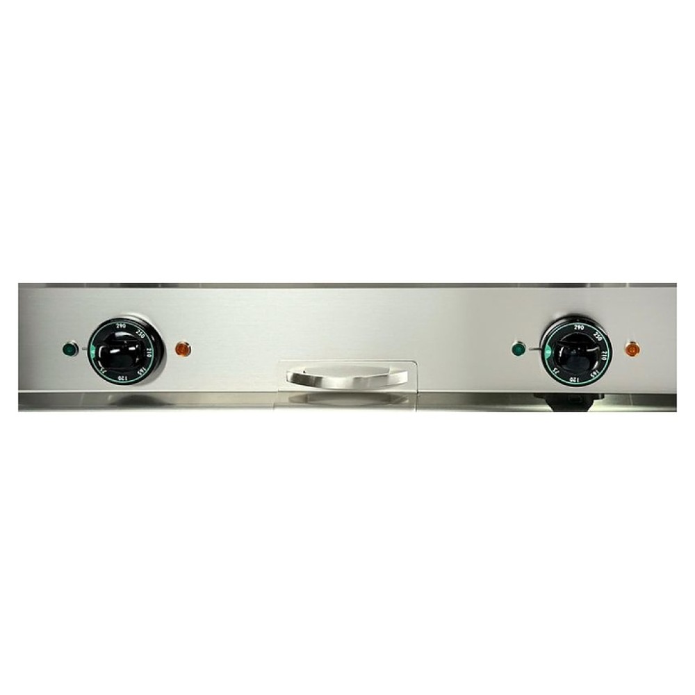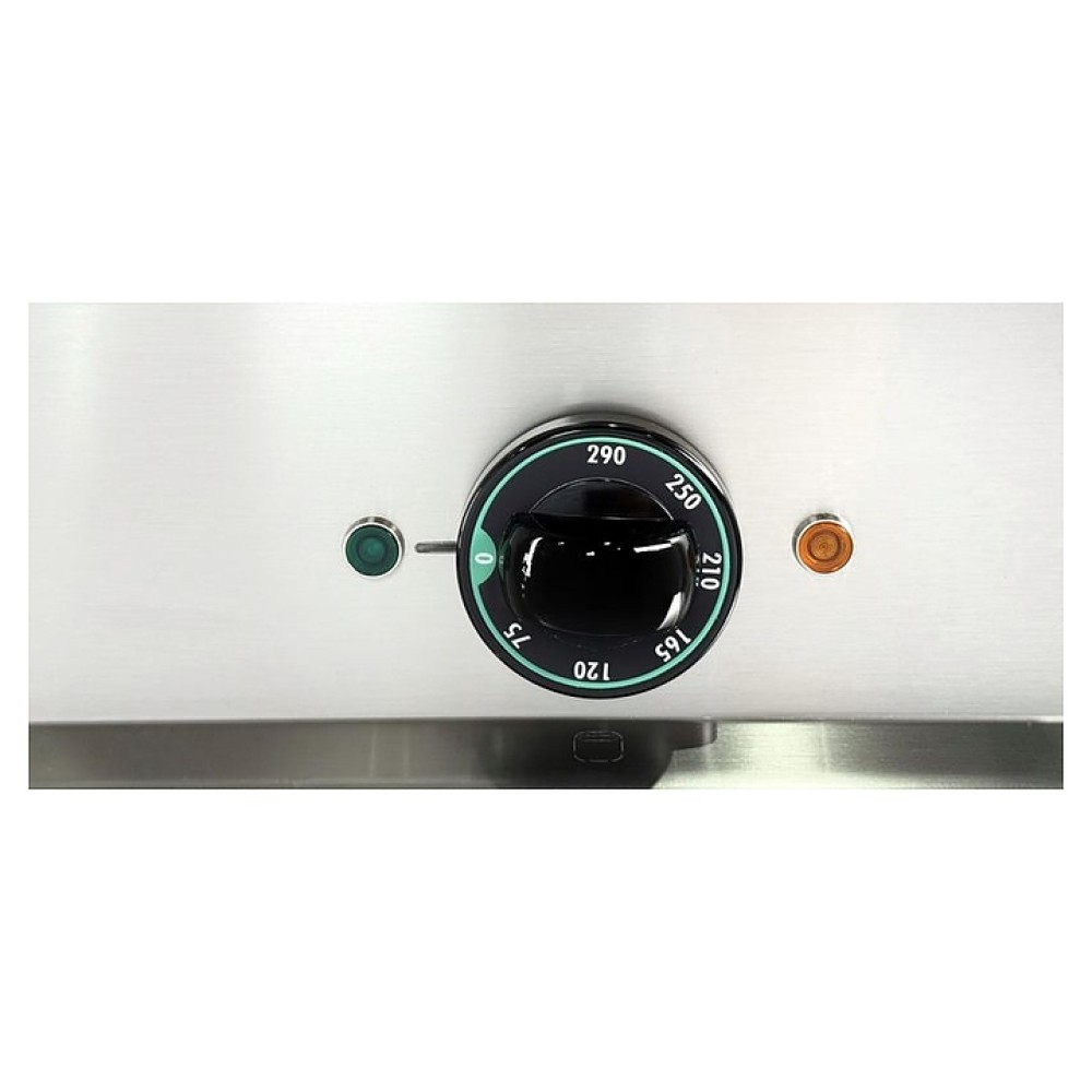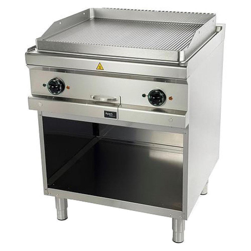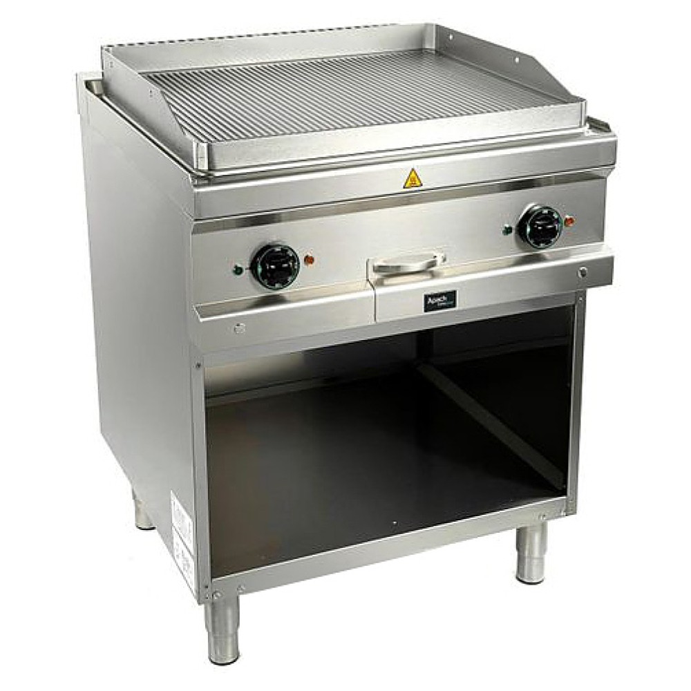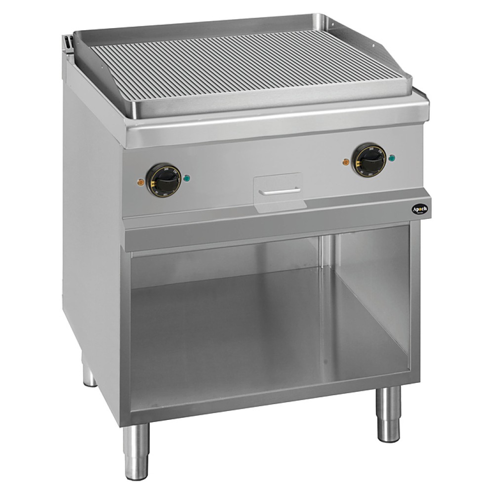 Жарочная поверхность Apach APTE-77PR/PL 700-й серии предназначена для обжарки мяса, рыбы и овощей на предприятиях общественного питания и торговли. Модель с закругленными краями и бортами оснащена электромеханической панелью управления с 2 терморегуляторами и 4 световыми индикаторами, выдвижным лотком для сбора остатков пищи, масла и жира и открытой подставкой с регулируемыми по высоте ножками. Корпус, панель управления и вытяжная решетка выполнены из нержавеющей стали AISI 304, рабочая поверхность – из конструкционной стали, боковые и задняя панели - из нержавеющей стали AISI 430, лоток - из нержавеющей стали.