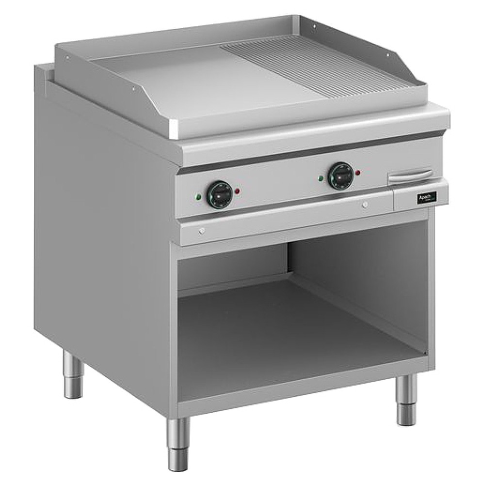 Жарочная поверхность Apach APTE-89PLR/PL 900-й серии предназначена для обжарки мяса, рыбы и овощей на предприятиях общественного питания и торговли. Модель с закругленными краями и бортами оснащена электромеханической панелью управления с 2 терморегуляторами и 4 световыми индикаторами, выдвижным лотком для сбора остатков пищи, масла и жира и открытой подставкой с регулируемыми по высоте ножками. Рабочая поверхность выполнена из конструкционной стали.