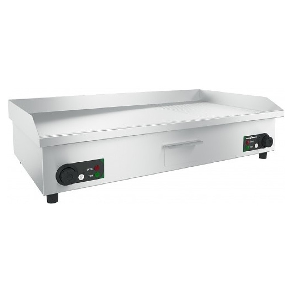 Настольная жарочная поверхность Пищевые Технологии ПЖ-К-860 используется на предприятиях пищевой промышленности, общественного питания и торговли самостоятельно или в составе технологических линий для приготовления широкого ассортимента блюд. Модель оснащена трубчатыми электронагревателями (ТЭНами), комбинированной рабочей поверхностью и электромеханической панелью управления. Корпус прибора, рабочая поверхность, задняя стенка и борт выполнены из нержавеющей стали, нижняя крышка и корпус утепления ТЭНов – из оцинкованной стали.