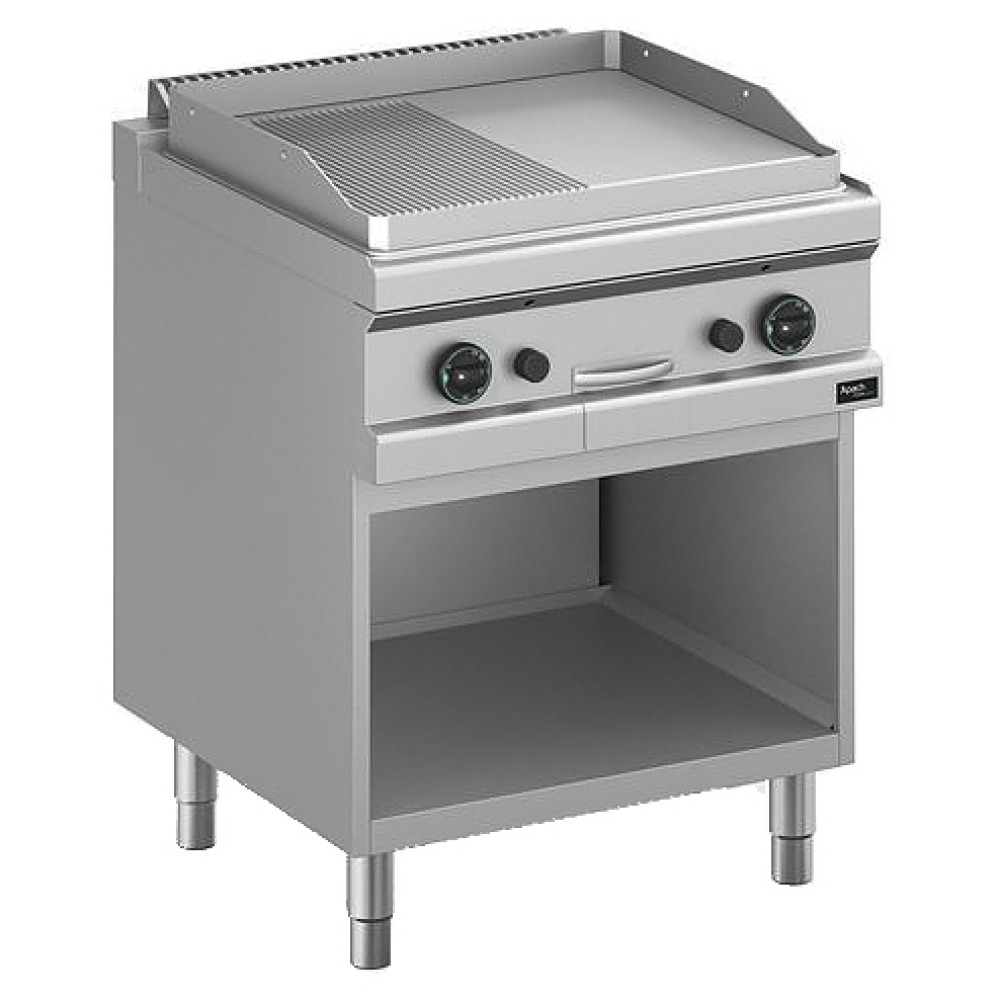 Открытая газовая сковорода Apach APTG-77PLR/PL 700-й серии предназначена для обжарки мяса, рыбы и овощей на предприятиях общественного питания и торговли. Модель с закругленными краями и бортами оснащена электромеханической панелью управления, горелками с пьезоэлектрическим поджигом и системой стабилизации пламени, выдвижным лотком для сбора остатков пищи, масла и жира и открытой подставкой с регулируемыми по высоте ножками.