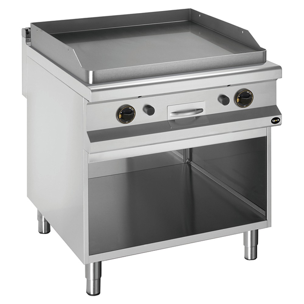 Открытая газовая сковорода Apach APTG-89PL/PL 900-й серии предназначена для обжарки мяса, рыбы и овощей на предприятиях общественного питания и торговли. Модель с закругленными краями и бортами оснащена электромеханической панелью управления с 2 терморегуляторами, горелками с пьезоэлектрическим поджигом и системой стабилизации пламени, выдвижным лотком для сбора остатков пищи, масла и жира и открытой подставкой с регулируемыми по высоте ножками.