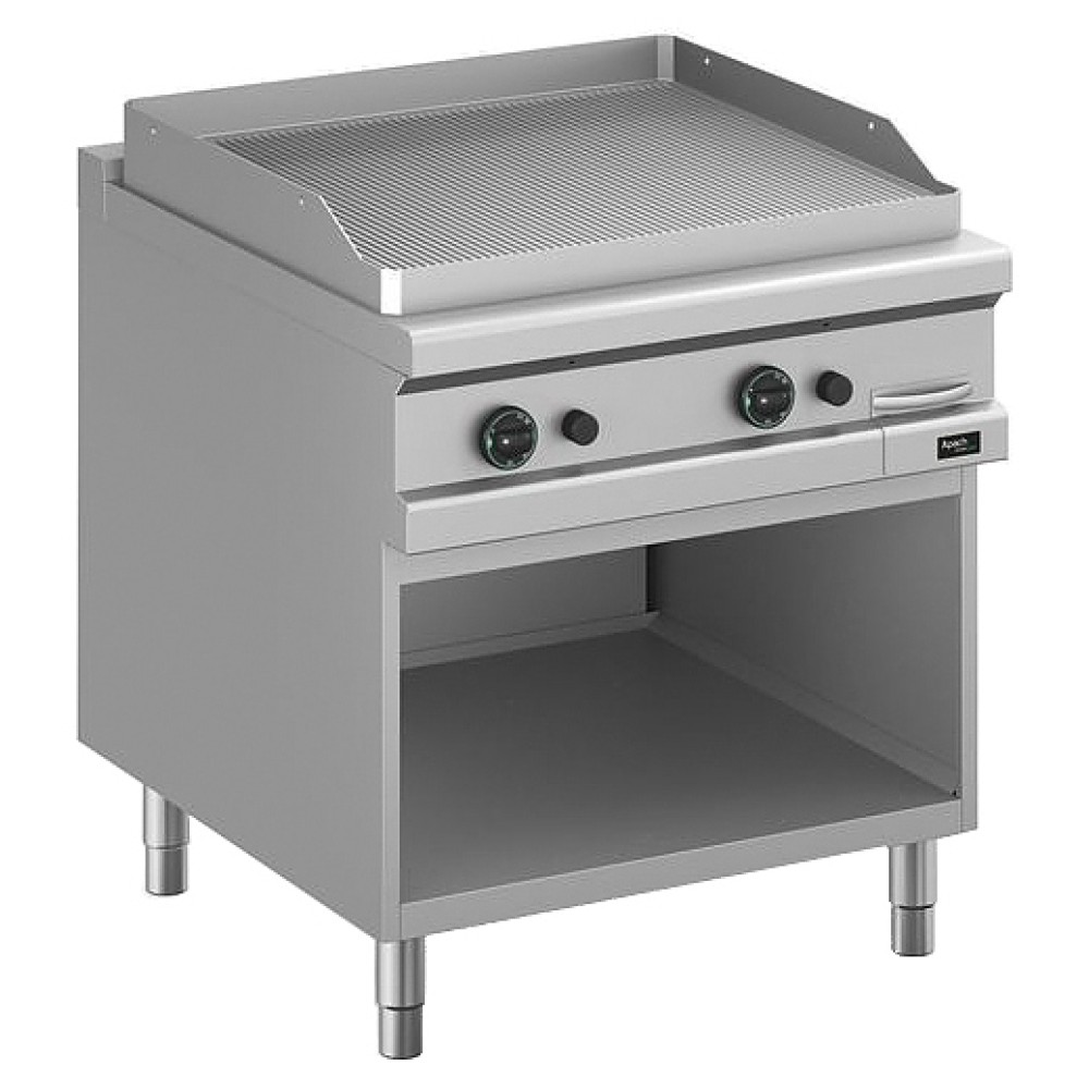 Открытая газовая сковорода Apach APTG-89PLR/PL 900-й серии предназначена для обжарки мяса, рыбы и овощей на предприятиях общественного питания и торговли. Модель с закругленными краями и бортами оснащена электромеханической панелью управления с 2 терморегуляторами, горелками с пьезоэлектрическим поджигом и системой стабилизации пламени, выдвижным лотком для сбора остатков пищи, масла и жира и открытой подставкой с регулируемыми по высоте ножками.