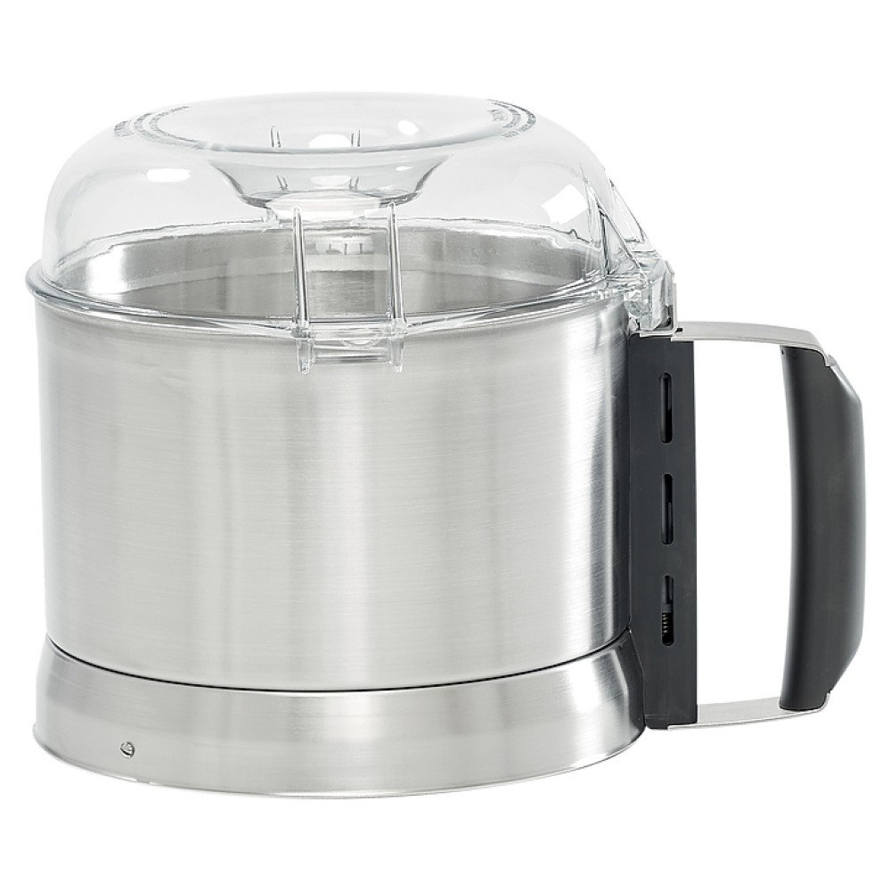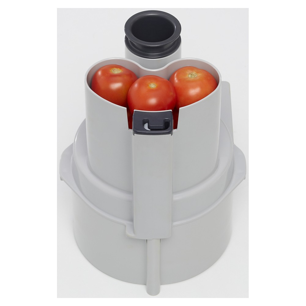 В комплект поставки входят чаша, съемный гладкий нож с запатентованным лезвием с низкой посадкой и 2 диска: слайсер 2 мм и терка 2 мм.