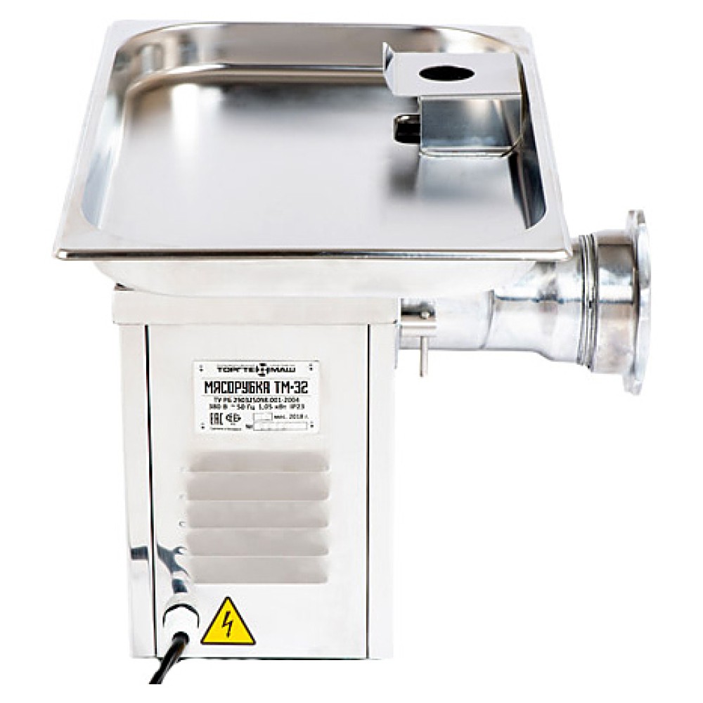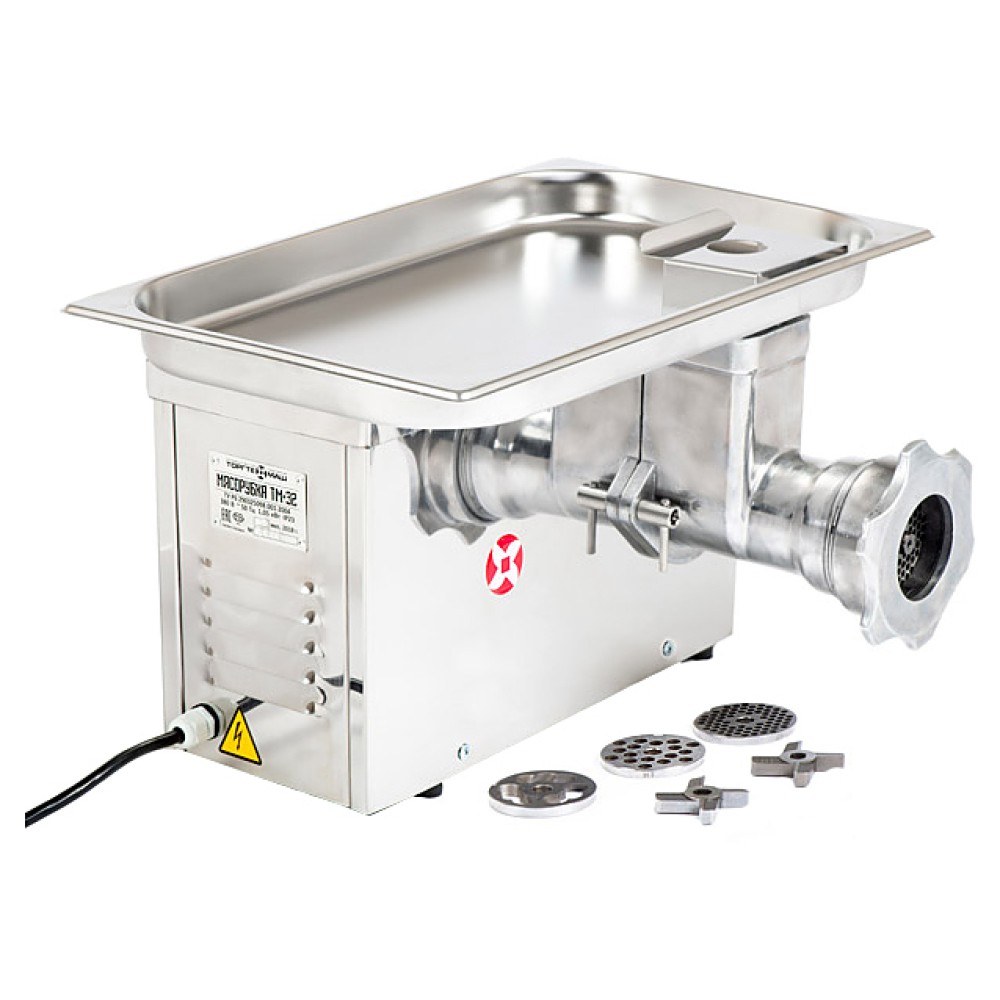 Мясорубка ТОРГТЕХМАШ ТМ-32 используется на предприятиях общественного питания и торговли для измельчения мяса и рыбы при производстве фарша, а также повторного измельчения котлетной массы и набивки колбас. Модель оснащена функцией Реверс, исключающей необходимость разборки мясорубки при попадании костей в горловину и наматывании жил на шнек. Облицовка корпуса выполнена из нержавеющей стали, ножи и решетки - из высококачественной нелегированной инструментальной стали марки У8А ГОСТ 1435 с твёрдостью поверхностей 52-59 HRC.