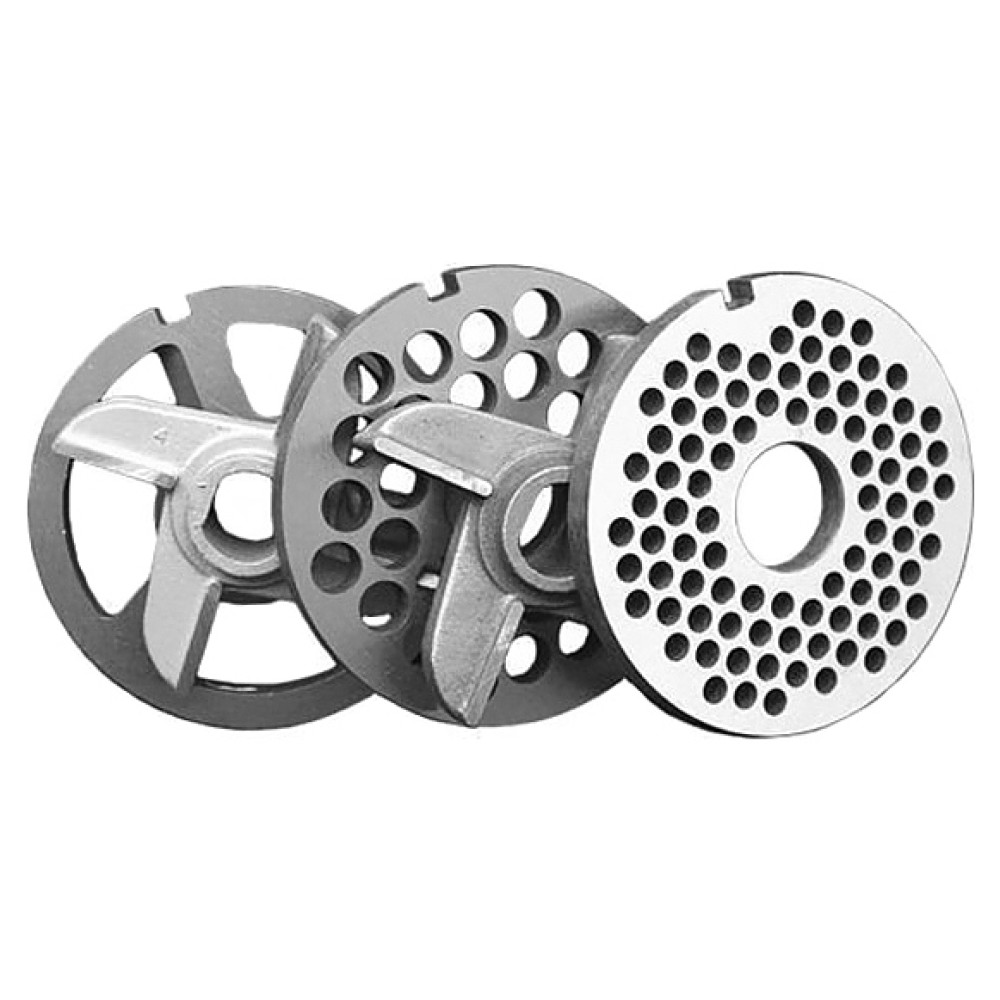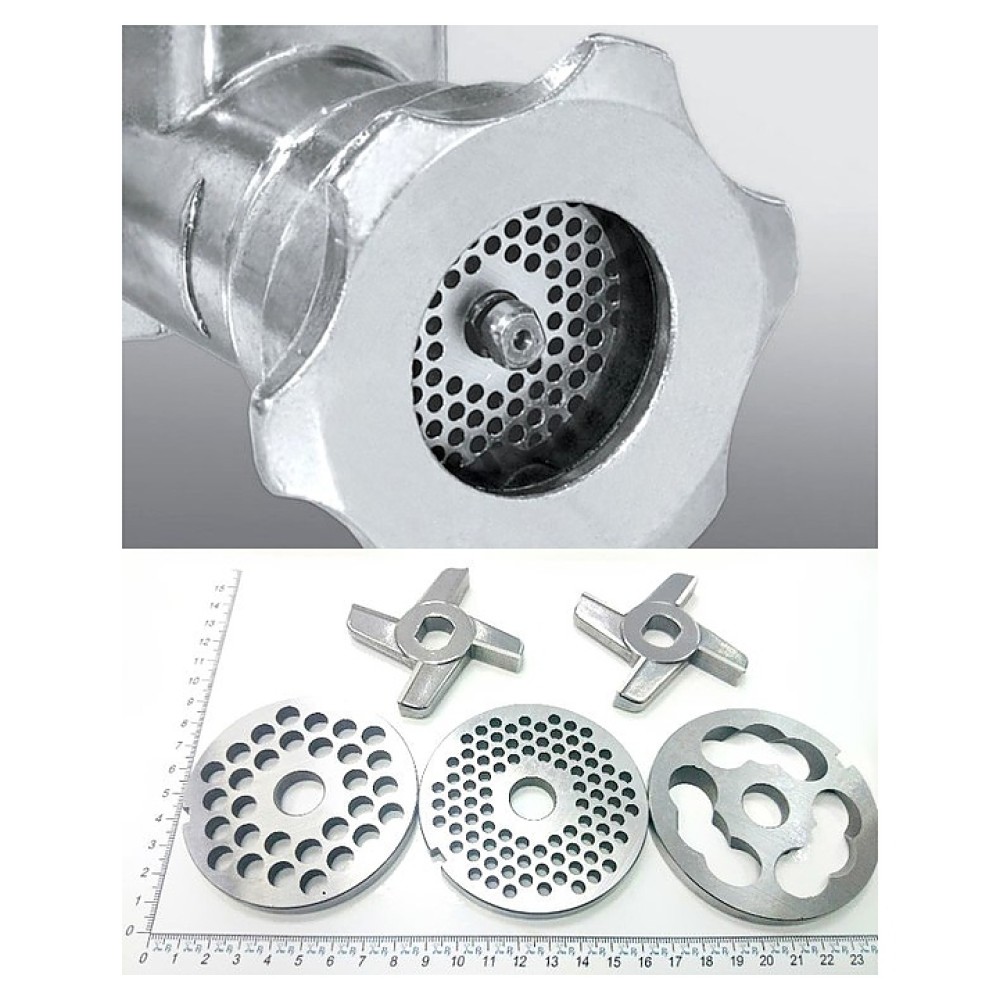 В комплект поставки входят подрезной нож, 2 двусторонних ножа, 2 решетки с отверстиями и насадка для купат.