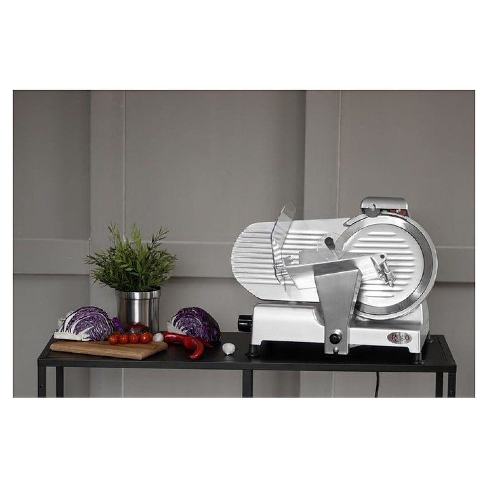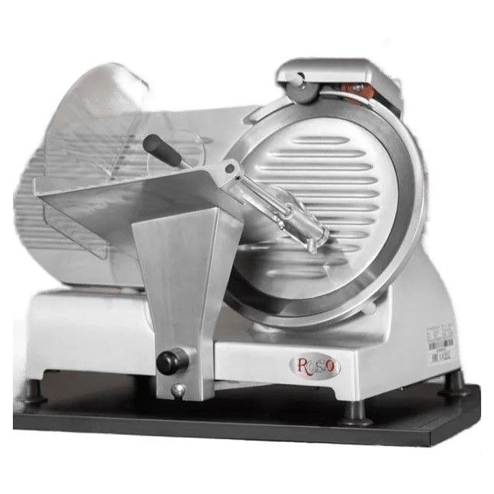 Слайсер Rosso HBS-220A PRO предназначен для нарезки продуктов на ломтики заданной толщины на предприятиях общественного питания и торговли. Модель оснащена округлым ножом, подвижной кареткой и ручкой-фиксатором. Блокиратор автоматически останавливает работу в случае перегрева двигателя.