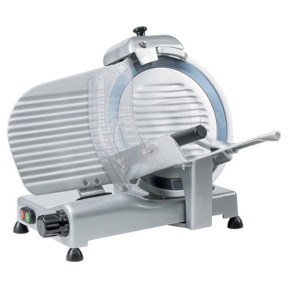 Слайсер FIMAR ECO300 предназначен для нарезки мяса, сыра, колбасных изделий и других продуктов питания на ровные и равные ломтики на предприятиях общественного питания и торговли. Модель оснащена фиксированным шлифовальным устройством с парой шлифмашин для заточки полотна, держателем ползунков с системой "Easy Clean" для облегчения очистки и фиксированным кольцом для защиты полотна. Корпус выполнен из окрашенного алюминиевого сплава.