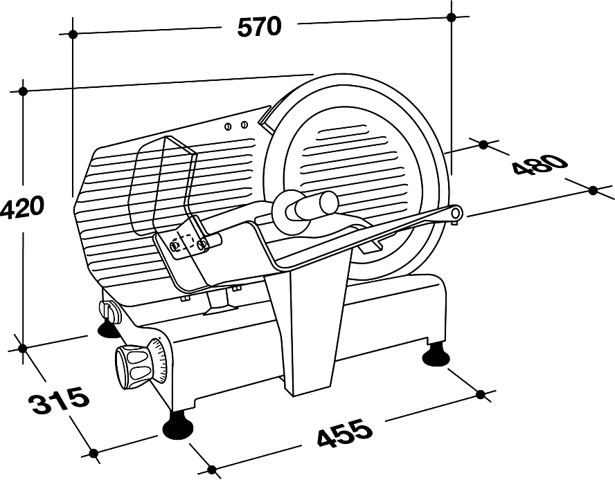 Профессиональный мотор с функцией принудительной вентиляции исключает возможность перегрева оборудования, а также делает его работу практически бесшумной. Слайсер оснащен фиксированным устройством для заточки ножа с двойным наждаком. Поддон для продуктов, перемычка для регулирования толщины среза, кольцо, покрывающее лезвие, и держатель продуктов выполнены из алюминия, отполированного путем анодирования, что обеспечивает их гигиеническую чистоту и защиту от коррозии.
