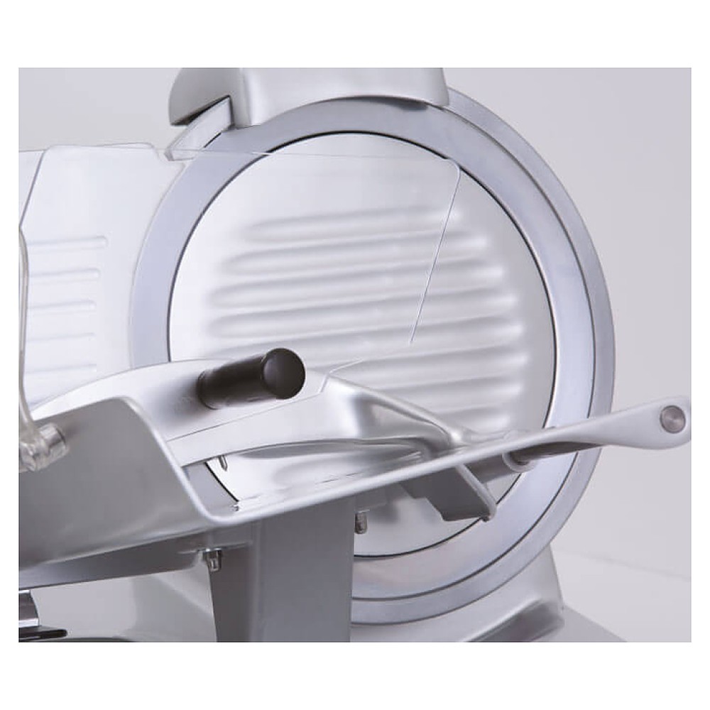 Слайсер RGV Lusso 275 S Prof предназначен для нарезки мяса, сыров, колбасных изделий, хлеба и других гастрономических изделий на ровные ломтики на предприятиях общественного питания, торговли и пищевой промышленности. Модель оснащена наклонным дисковым ножом. Основание выполнено из алюминия, покрытого пригодной для контакта с пищевыми продуктами краской, лезвие – из закаленной шлифованной стали с твердым хромированным покрытием, крышка ножа, лоток для продуктов и перегородка для регулировки нарезки – из анодированого алюминия с полированным покрытием, защитный экран – из плексигласа.