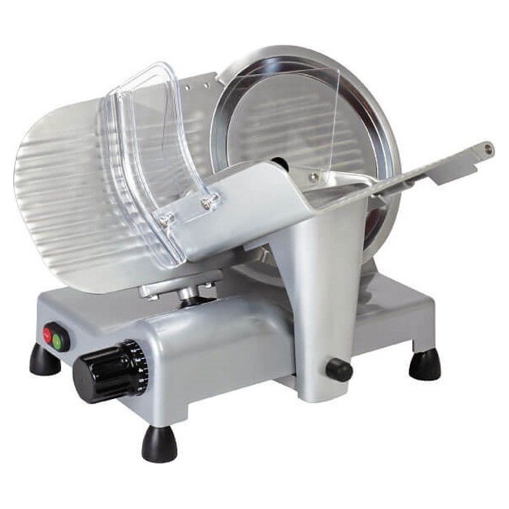 Слайсер RGV Lusso 300 A-L Prof предназначен для нарезки мяса, сыров, рыбы, хлеба и других гастрономических изделий на ровные ломтики на предприятиях общественного питания, торговли и пищевой промышленности. Модель оснащена наклонным дисковым ножом. Основание выполнено из алюминия, покрытого пригодной для контакта с пищевыми продуктами краской, лезвие – из закаленной шлифованной стали с твердым хромированным покрытием, крышка ножа, лоток для продуктов, перегородка для регулировки нарезки и фиксированное защитное кольцо лезвия – из анодированого алюминия с полированным покрытием, защитный экран – из плексигласа.