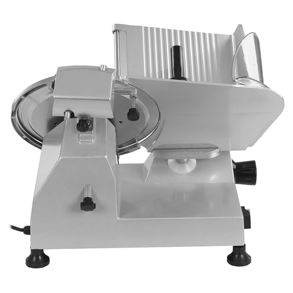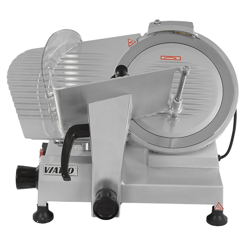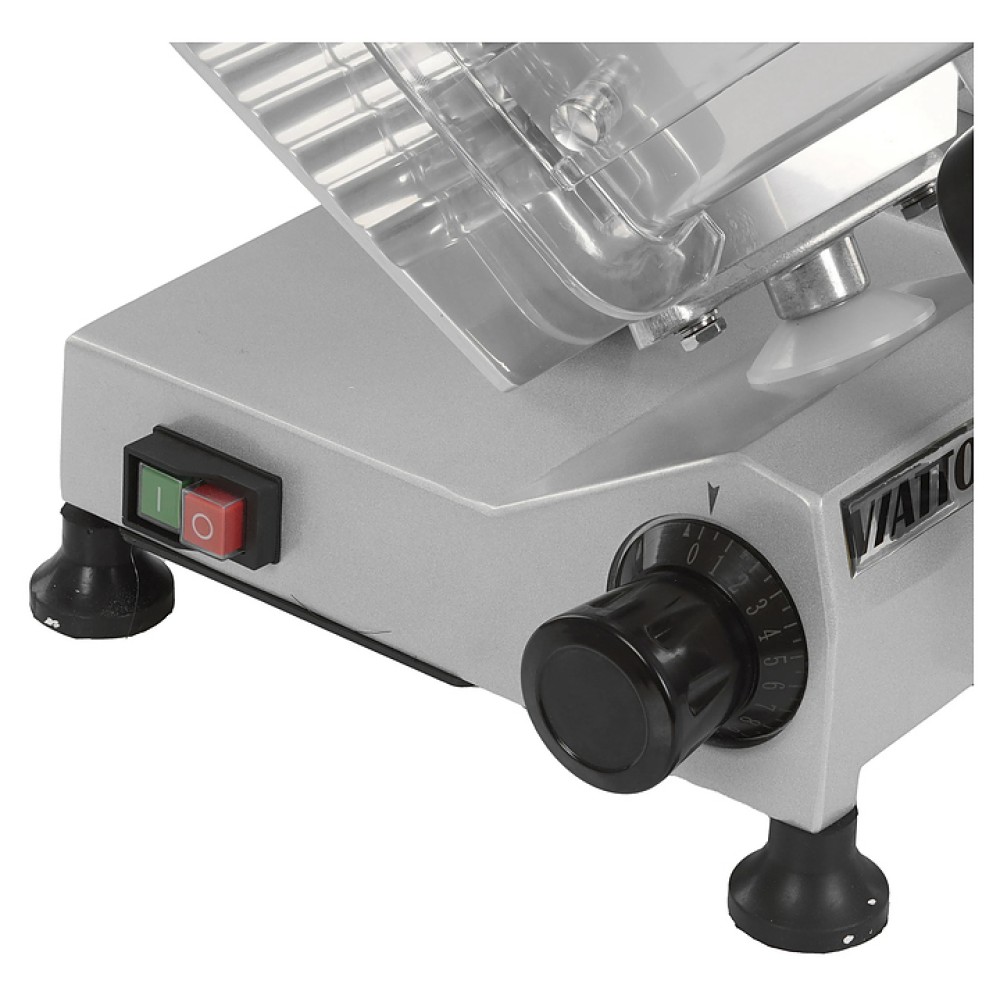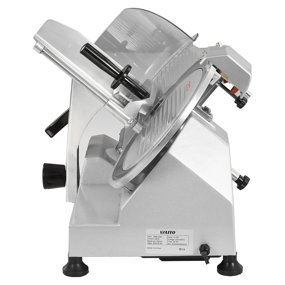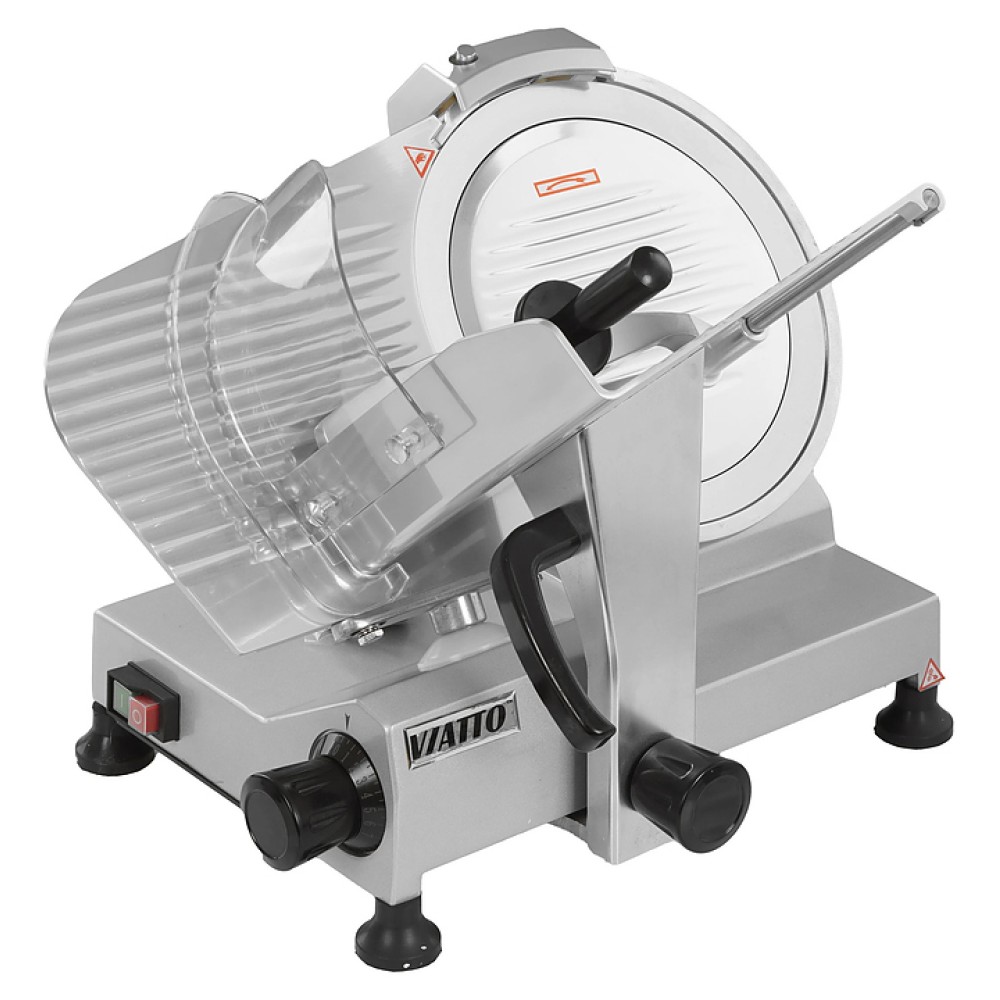 Полуавтоматический слайсер VIATTO VA-300 используется на предприятиях общественного питания и торговли для нарезки мяса, сыра, колбасных изделий и других пищевых продуктов на ровные и равные ломтики. Модель оснащена съемным затачивающим устройством, механизмом регулировки толщины нарезки и устойчивыми нескользящими опорами. Корпус выполнен из алюминия.