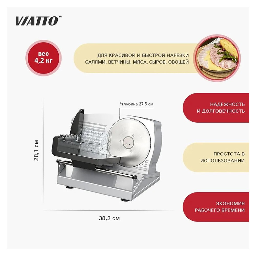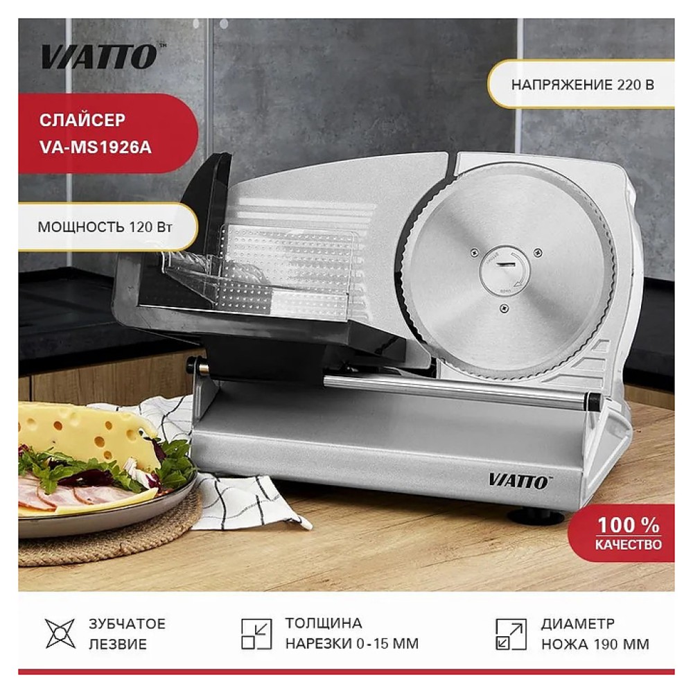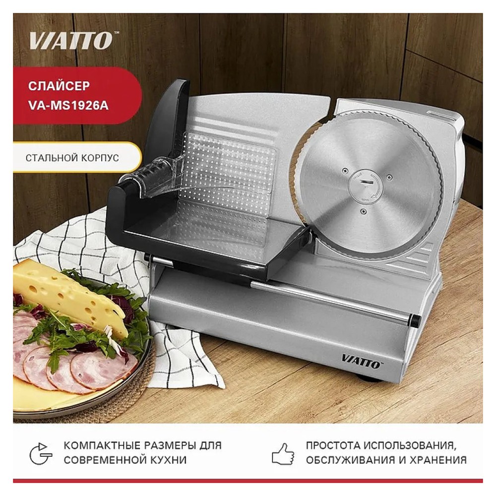 Слайсер VIATTO VA-MS1926A предназначен для нарезки тонкими одинаковыми ломтиками приготовленного мяса, колбасных изделий, сыра и овощей на предприятиях общественного питания и торговли. Модель оснащена зубчатым лезвием и регулятором толщины нарезки. Корпус выполнен из железного сплава.
