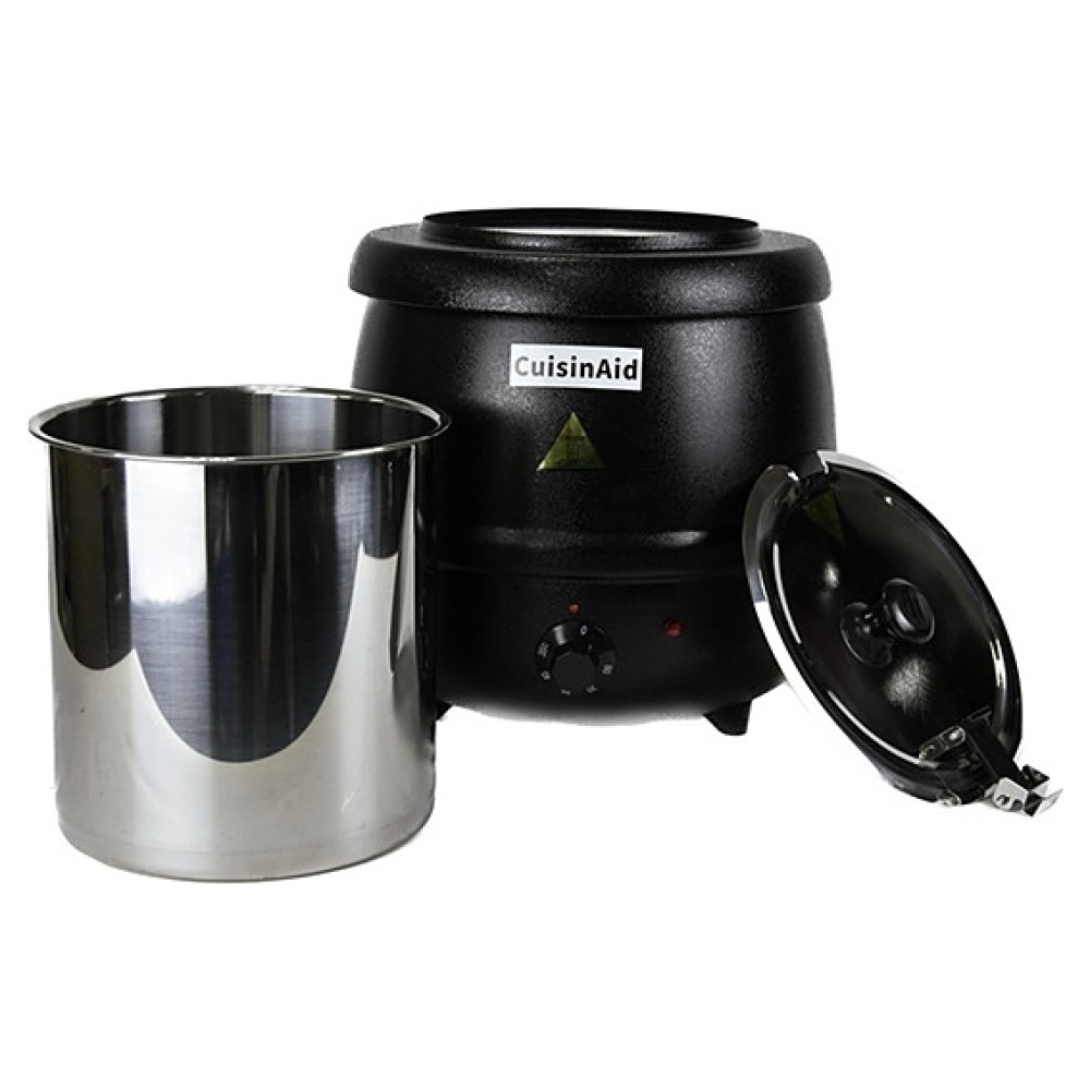 Электрический мармит CuisinAid CD-83010SP используется на предприятиях общественного питания и торговли, мероприятиях с организацией шведского стола для поддержания в горячем состоянии супов, бульонов и других жидких продуктов. Модель оснащена электромеханическим управлением. Корпус черного цвета выполнен в форме горшочка.