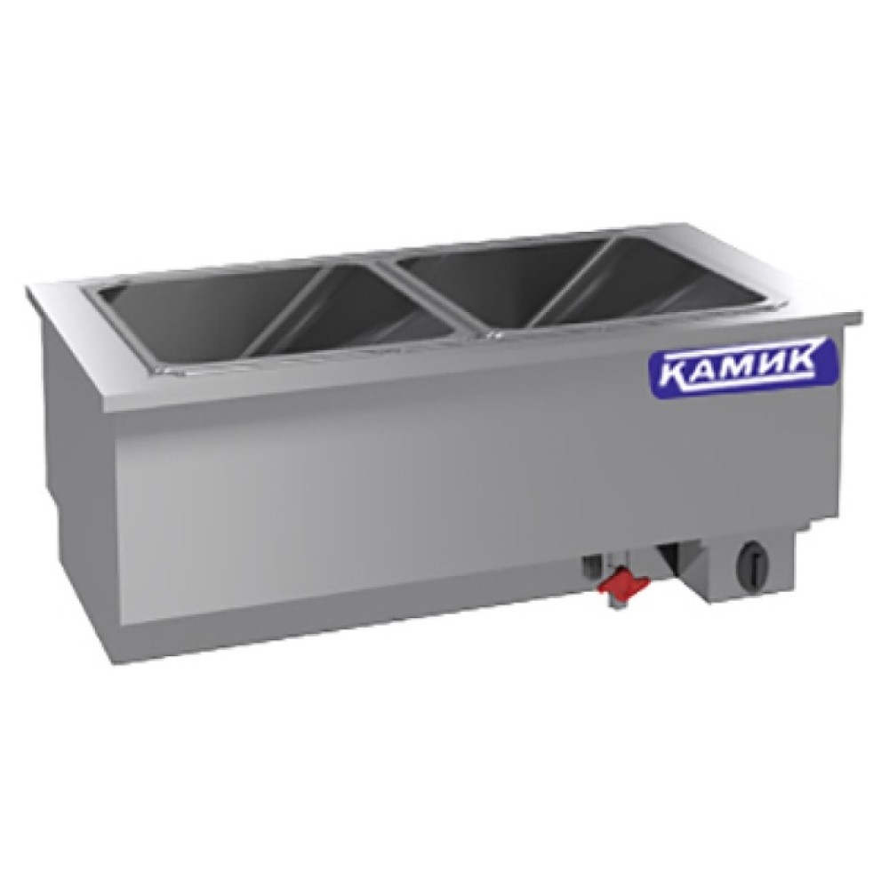 Тепловой мармит КАМИК МУ-344929 используется на предприятиях общественного питания и торговли для кратковременного хранения, демонстрации и поддержания в горячем состоянии супов, гарниров, вторых блюд и соусов. Модель оснащена ванной с теплоизоляцией и делителем. В правой части конструкции расположен термостат, позволяющий регулировать температуру. Корпус выполнен из нержавеющей стали AISI 430.