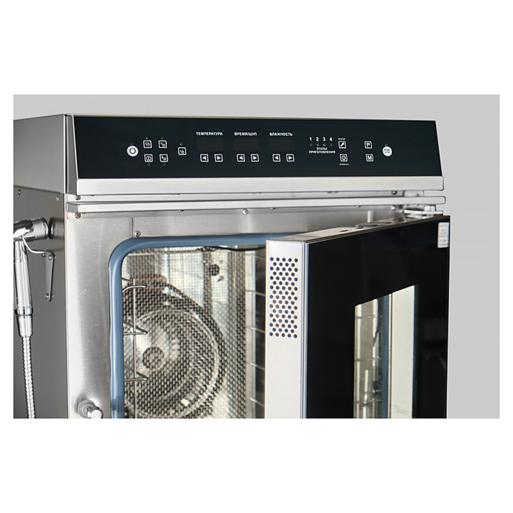 Пароконвектомат Abat ПКА 6-2/3П-01 бойлерного типа с автоматической мойкой предназначен для приготовления различных блюд методом обработки паром и горячим воздухом по отдельности или комбинированно на предприятиях общественного питания. Модель оснащена ручным душем, удобной панелью управления с мембранной клавиатурой и внутренней подсветкой камеры.