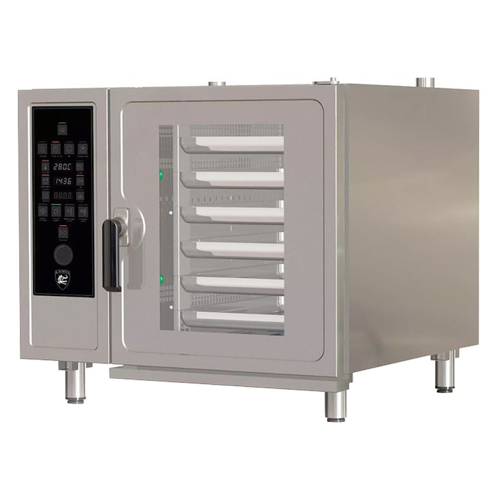 Пароконвектомат KAYMAN FLASHTASTE BASE ПКЭ-6Б-БА предназначен для различных видов тепловой обработки продуктов на предприятиях общественного питания и торговли. Модель оснащена электронной панелью управления, бойлером, одноканальным щупом и душирующим устройством. Корпус выполнен из нержавеющей стали.