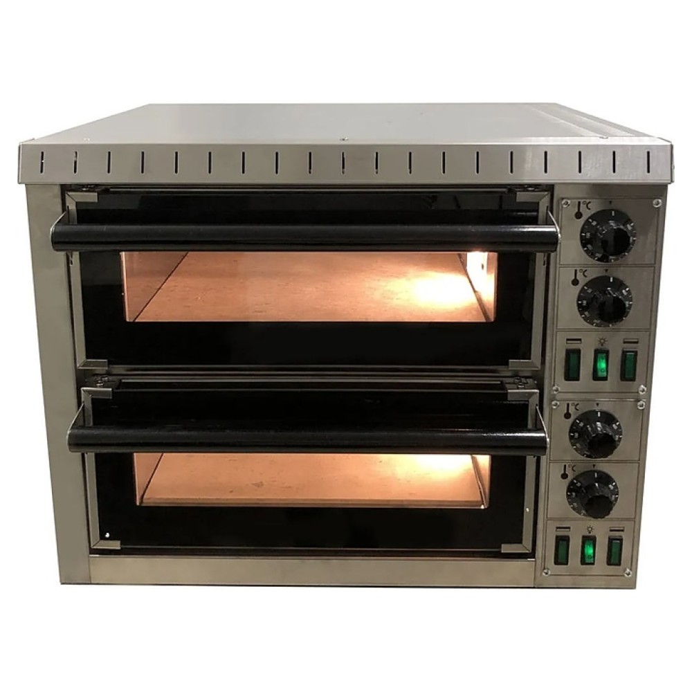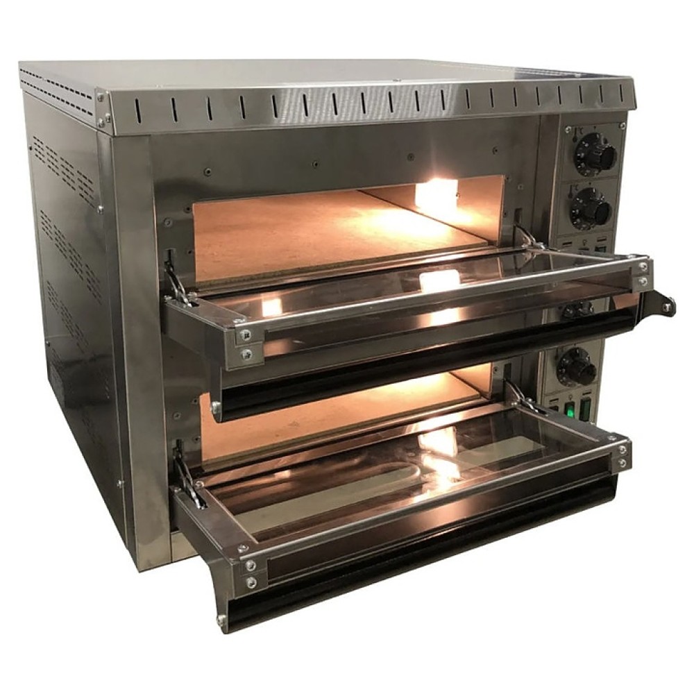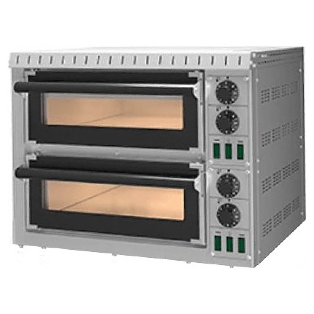 Печь ENTECO MACTER Ш-43-02 предназначена для выпечки и разогрева пиццы, а также приготовления блюд типа лазаньи на предприятиях общественного питания и торговли. Модель оснащена 2 рабочими камерами, откидными дверьми с горизонтальными рукоятками, панелью управления с 4 круговыми регуляторами и светодиодными индикаторами. Корпус и облицовка камер выполнены из высококачественной нержавеющей стали.