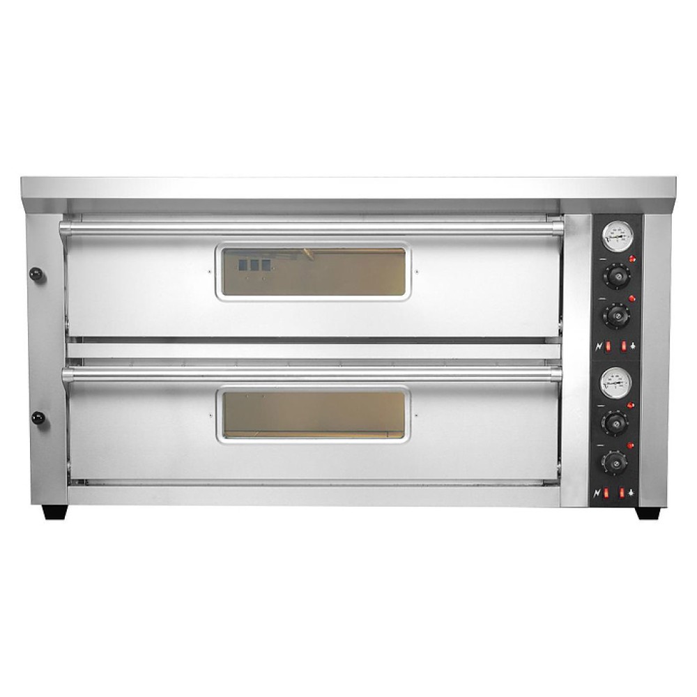 Подовая печь для пиццы Kocateq EPC2/100x70TT используется на предприятиях общественного питания и торговли, в пекарнях и кондитерских для выпечки пиццы, горячих сэндвичей и хлебобулочных изделий. Модель оснащена механической панелью управления и термостатами, раздельными для верхней части камеры и пода, для регулировки нагрева и поддержания температуры. Фронтальная часть и дверь печи изготовлены из нержавеющей стали, боковые панели и верх из эмалированной стали черного цвета, под - из керамики.