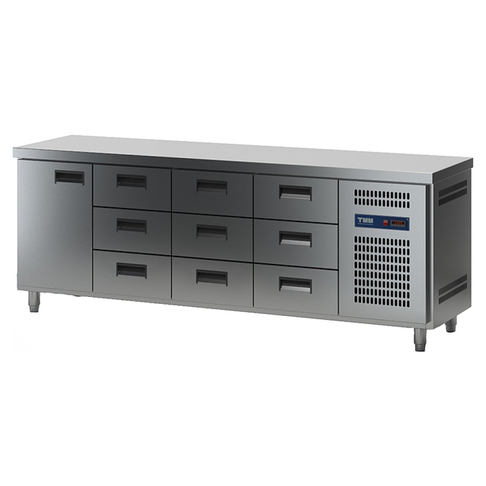 Холодильный стол ТММ СХСБ-К-1/1Д-9Я предназначен для раскатки теста, обработки ингредиентов для приготовления блюд, охлаждения и кратковременного хранения скоропортящихся продуктов и напитков на предприятиях общественного питания и торговли. Цельнозаливной корпус и фасад выполнены из нержавеющей стали AISI 340, задняя стенка - из оцинкованной стали.
