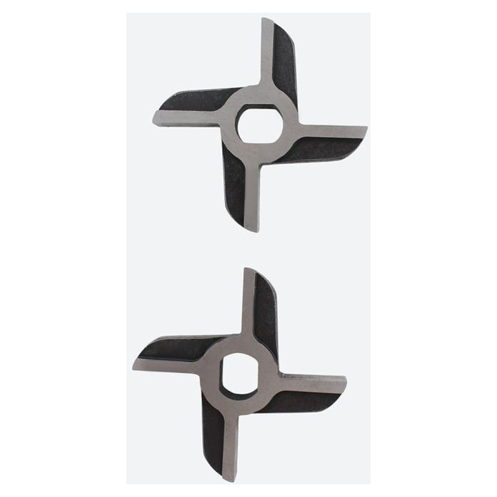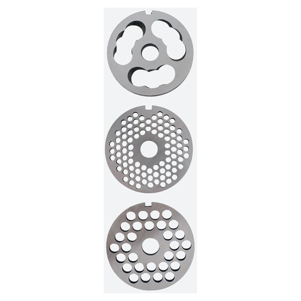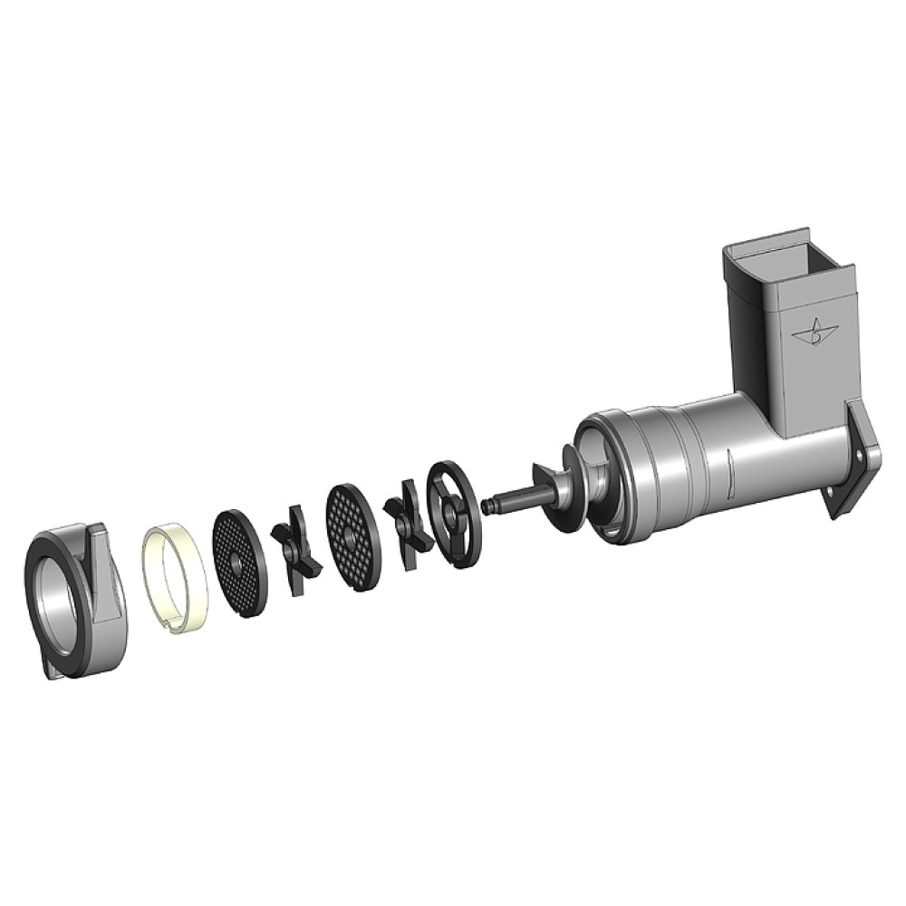 В комплект поставки входят нож подрезной, 2 двусторонних ножа, 2 решетки с отверстиями (№2 и № 3), насадка для набивки колбас и толкатель.