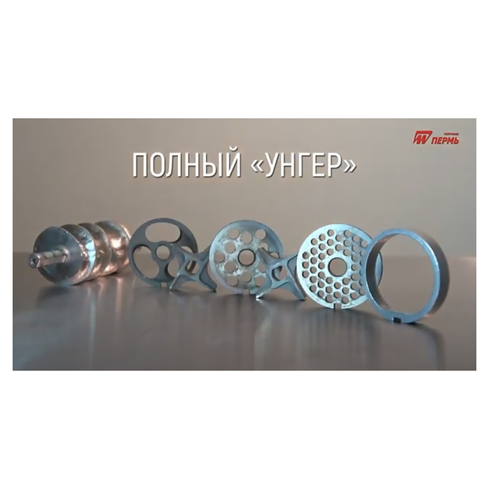 В комплект поставки входят решетка подрезная, 2 двусторонних ножа, 2 решетки с отверстиями (5 и 9 мм) и толкатель.