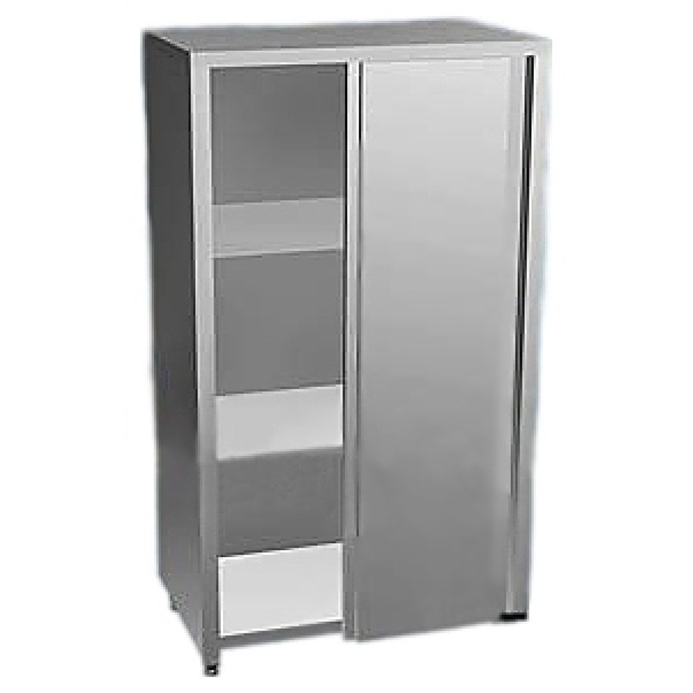 Выполненный из высококачественной нержавеющей стали, шкаф оснащен практичными и удобными дверями-купе. Внутреннее пространство изделия снабжено 2 полками, которые могут быть расположены на разной высоте. Шкаф имеет регулируемые по высоте опоры, позволяющие устранить практически любые неровности пола.